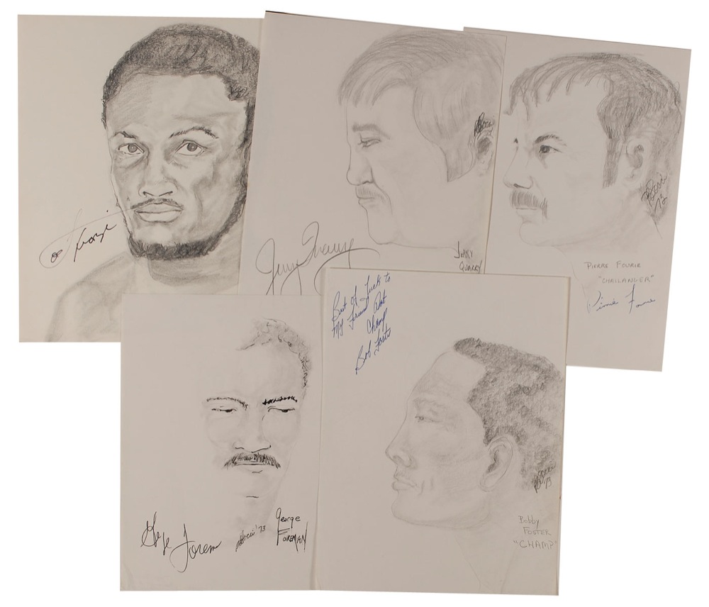 Five original pencil sketches of celebrated boxers, each measuring approximately 8.75 x 11.25, all done by an admirer, each signed in ink or pencil by the respective boxer pictured. Signers are: Joe Frazier, George Foreman (ink and pencil sketch), Bob Foster, Jerry Quarry, and Pierre Fourie. Light toning, rubbing, and notations from the artist, otherwise fine condition. RR Auction COA.
