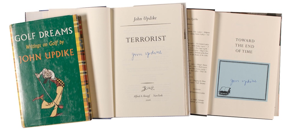 Three books: Golf Dreams, signed in black ink on the title page, “John Updike”; Towards the End of Time, signed on a bookplate affixed to the half-title page in blue felt tip; and Terrorist, signed on the title page in blue felt tip. In fine condition, with rubbing to the dustjacket of the first book. RRAuction COA.