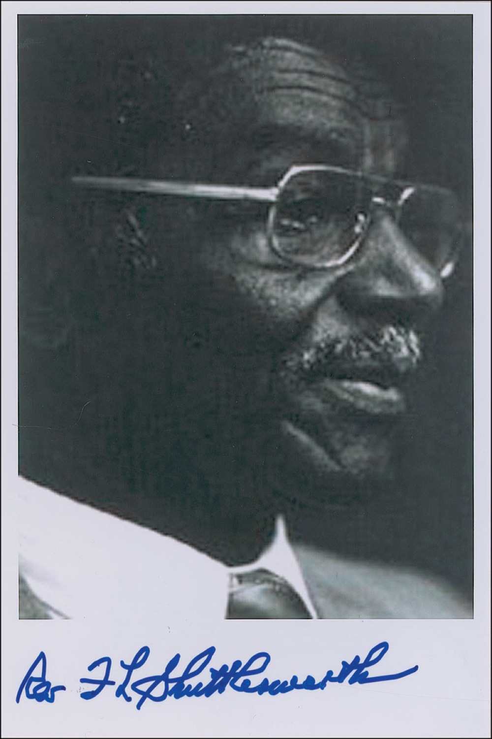 Two glossy laser print photos, 4 x 6 and 6 x 4, the first featuring James Meredith surrounded by bodyguards outside of an institution, signed in black felt tip, and the other a close-up of Reverend Fred Shuttlesworth, signed in the bottom border in blue felt tip, “Rev. F. L. Shuttlesworth.” In fine condition, with two trivial dings to Meredith’s photo, and a grainy quality to Shuttlesworth’s image. RRAuction COA.