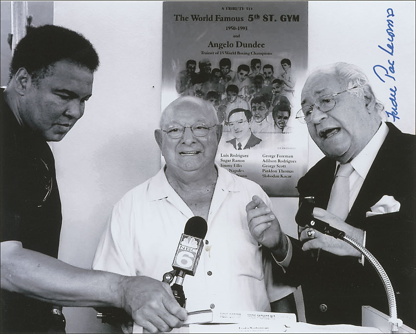Satin-finish 10 x 8 photo of Pacheco, Angelo Dundee, and Muhammad Ali at a press conference, signed vertically in blue felt tip by Pacheco. In fine condition, with a few light creases along the bottom edge. RRAuction COA.