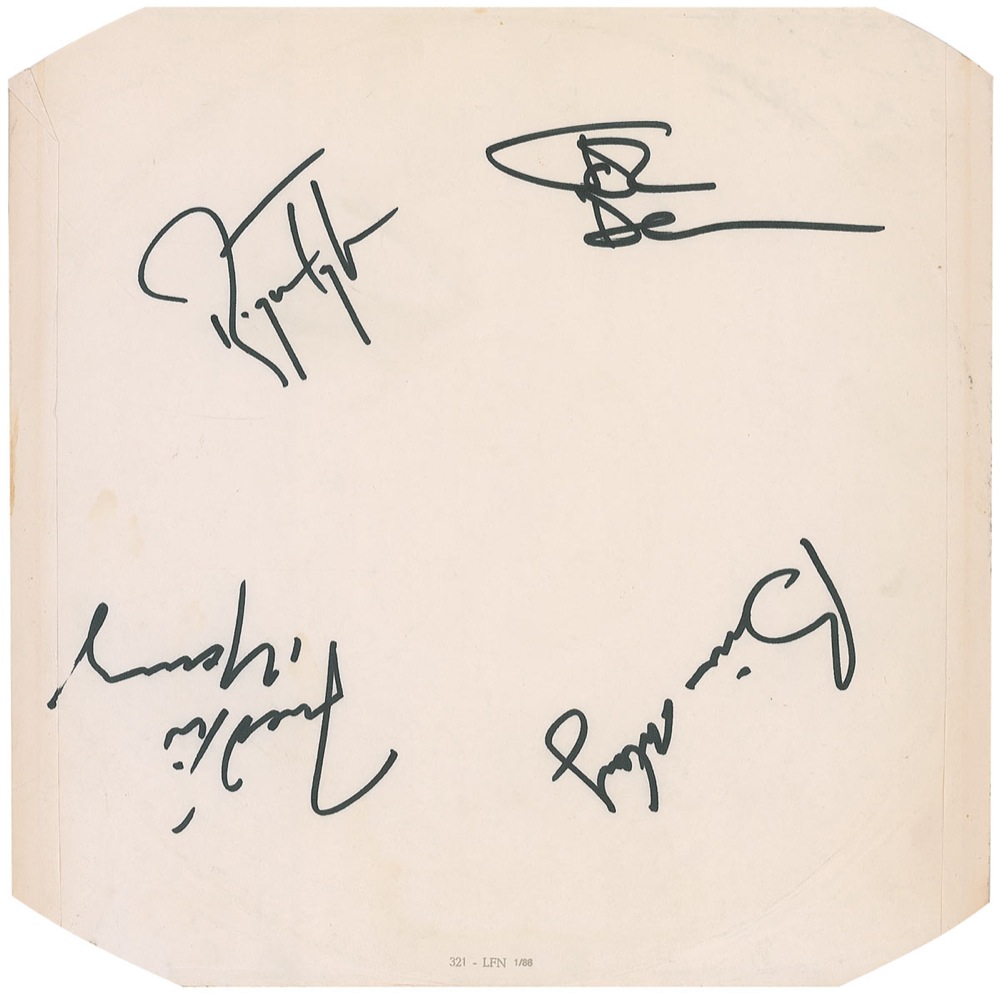Test pressing sleeve for the 1986 album, A Kind of Magic, signed in black felt tip by Freddie Mercury, Brian May, Roger Taylor, and John Deacon. Original White Label copy of the record is included. In fine condition, with light toning and a few trivial areas of soiling. Accompanied by a letter of provenance from the consignor. RRAuction COA.