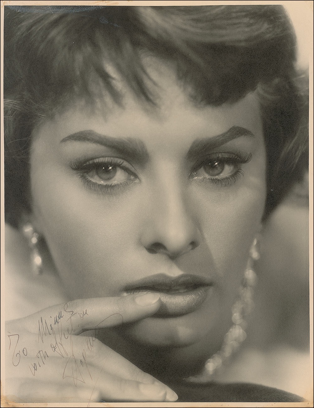 Captivating vintage matte-finish 11 x 14 close-up photo, signed and inscribed in fountain pen, “To Minna, With affection, Sophia.” Mild toning and soiling to the corners, a white surface mark towards the top left corner, and the signature a bit light, otherwise fine condition. Pre-certified PSA/DNA and RR Auction COA.