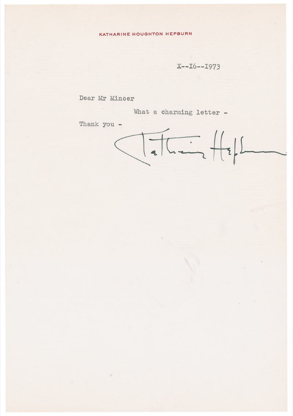 Brief TLS, one page, 7.25 x 10.25, personal letterhead, October 16, 1973. “What a charming letter. Thank you.” In fine condition, with light creasing towards the top left corner. Pre-certified PSA/DNA and RR Auction COA.