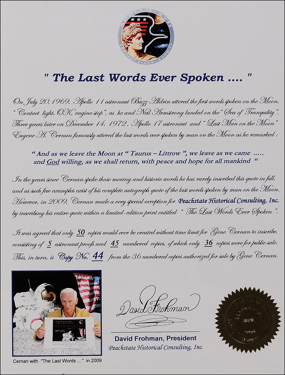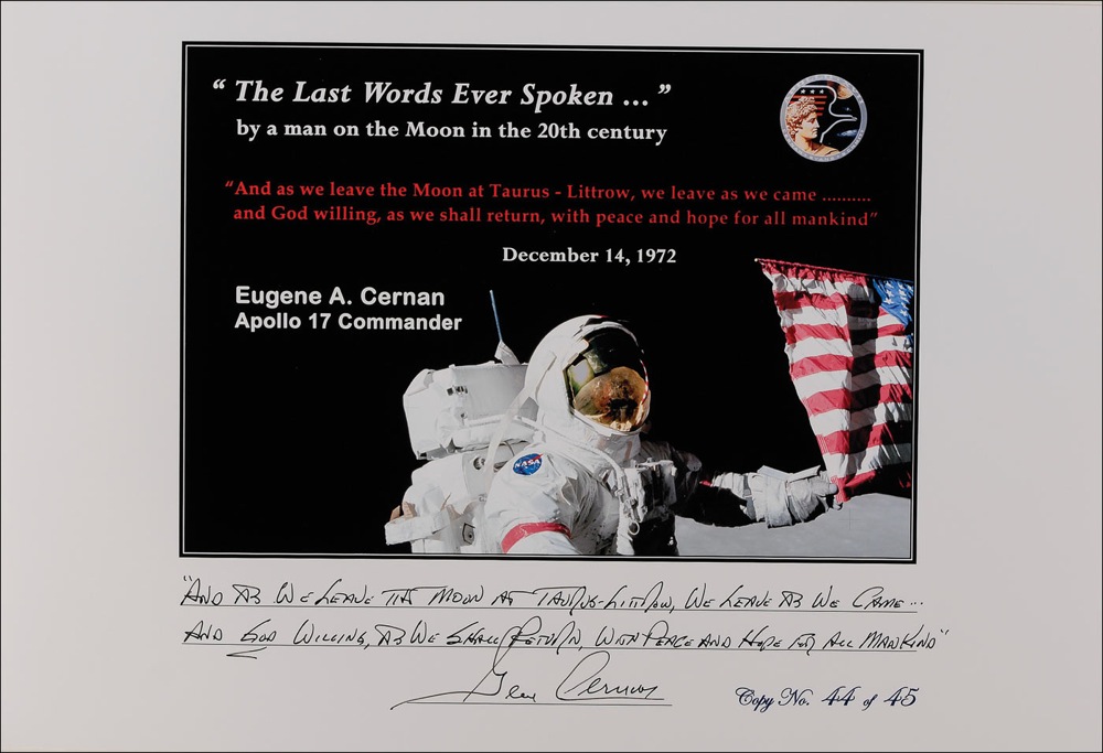 Color very limited edition 19 x 13 manuscript print entitled “The Last Words Ever Spoken,” numbered #44/45, bearing an image of Cernan on the lunar surface and a printed quotation of his last words spoken on the moon, signed in black felt tip underneath the image, with Cernan writing out the final words ever spoken by man on the moon: “And as we leave the Moon at ‘Taurus—Littrow,’ we leave as we came…and God willing, as we shall return, with peace and hope for all mankind,” and signed underneath, “Gene Cernan.” In fine condition. In the years since leaving the moon, Cernan has rarely inscribed this quote in full, and as such few examples exist. This copy is one of only 45 examples that were created, and one of only 36 authorized for sale to collectors by Cernan. Pre-certified Steve Zarelli and RR Auction COA.