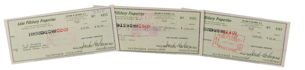 Three business checks from Lake Pillsbury Properties, all 8.5 x 3.5, all dated between 1969–1971, and all filled out in type and signed by Haley. Expected stamps, and vertical folds to all checks, one through a single letter of signature, otherwise fine condition. RRAuction COA.