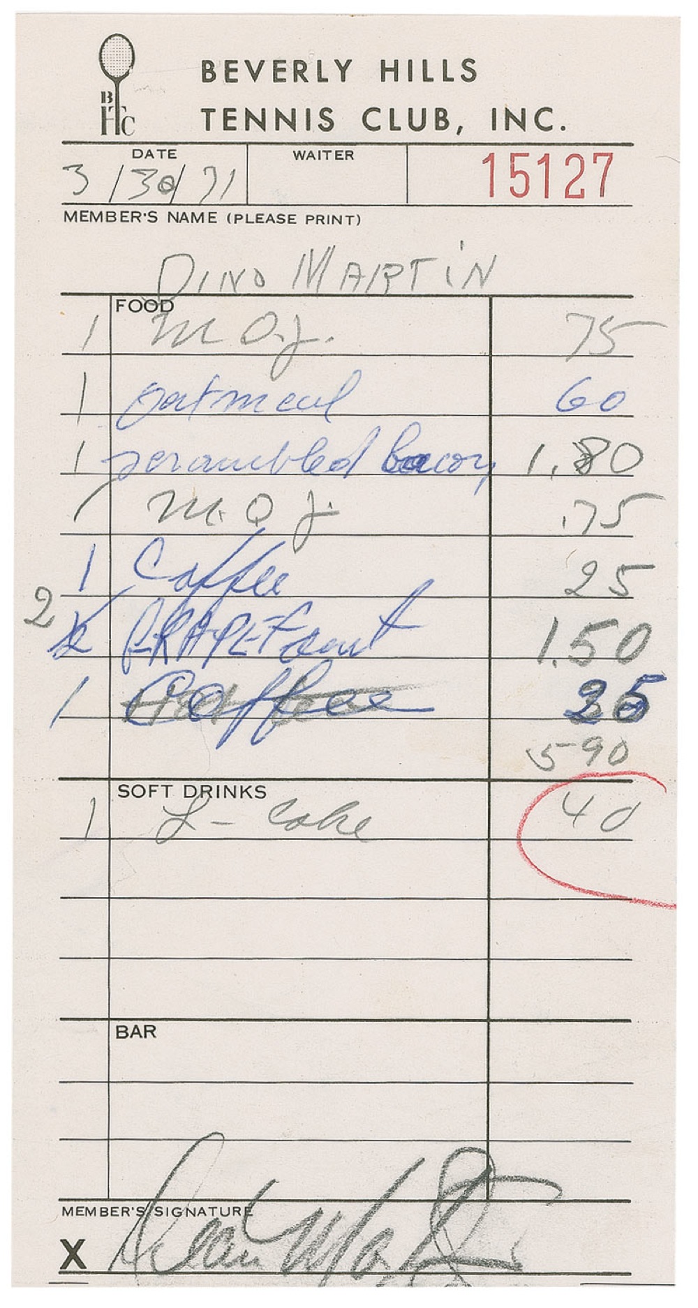 Food and beverage check, 3.5 x 7 from the Beverly Hills Tennis Club, dated March 30, 1971, for a total of $5.90 for breakfast, signed at the bottom in pencil by Martin. In fine condition. Pre-certified PSA/DNA and RR Auction COA.