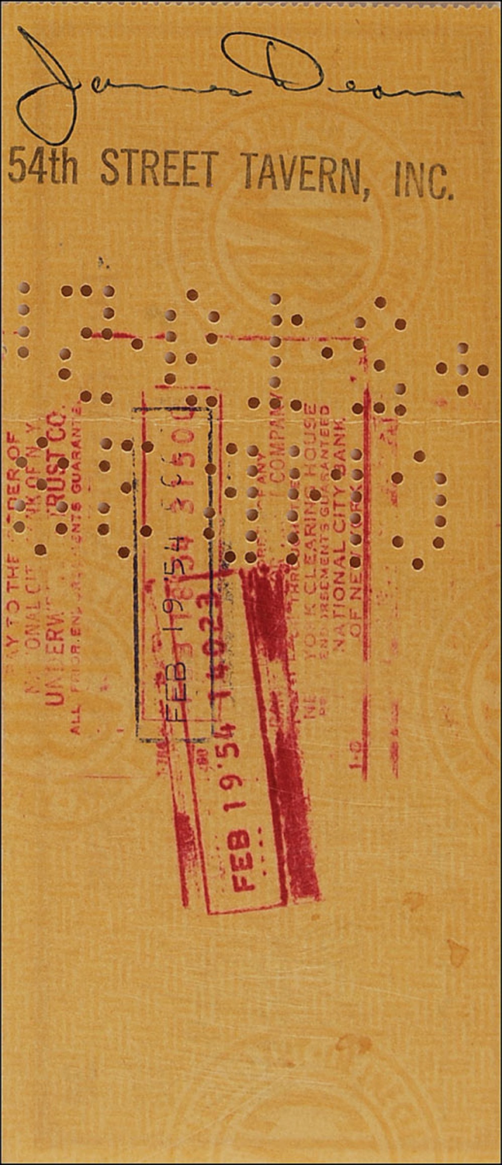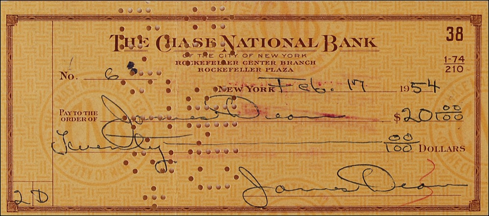 American actor (1931–1955) best known for his star turns in three 1950s screen classics: East of Eden, Rebel Without a Cause, and Giant. His untimely death in a high-speed car crash came to represent the very embodiment of the “live fast, die young” philosophy—and elevated him to the status of a legend that remains unique in the annals of Hollywood. Rare and highly desirable bank check, 6 x 2.75, filled out and signed by Dean, “James Dean,” payable to James Dean for $20.00, February 17, 1954. Check is also endorsed on the reverse, “James Dean,” above a 54th Street Tavern Inc. stamp. Dean hung out at the 54th Street Tavern and the establishment would cash his checks. The tavern is mentioned in all of Dean’s biographies. A vertical fold through a single letter of first signature, cancellation holes through portion of the same signature, show-through from stamps on reverse, and a red cancellation stroke through single letter of second signature, otherwise fine condition. Dean would leave New York for Los Angeles on April 8, 1954, to begin shooting Elia Kazan’s East of Eden, the role that would garner him the first posthumous acting nomination in the history of the Academy Awards. Pre-certified PSA/DNA and RR Auction COA.