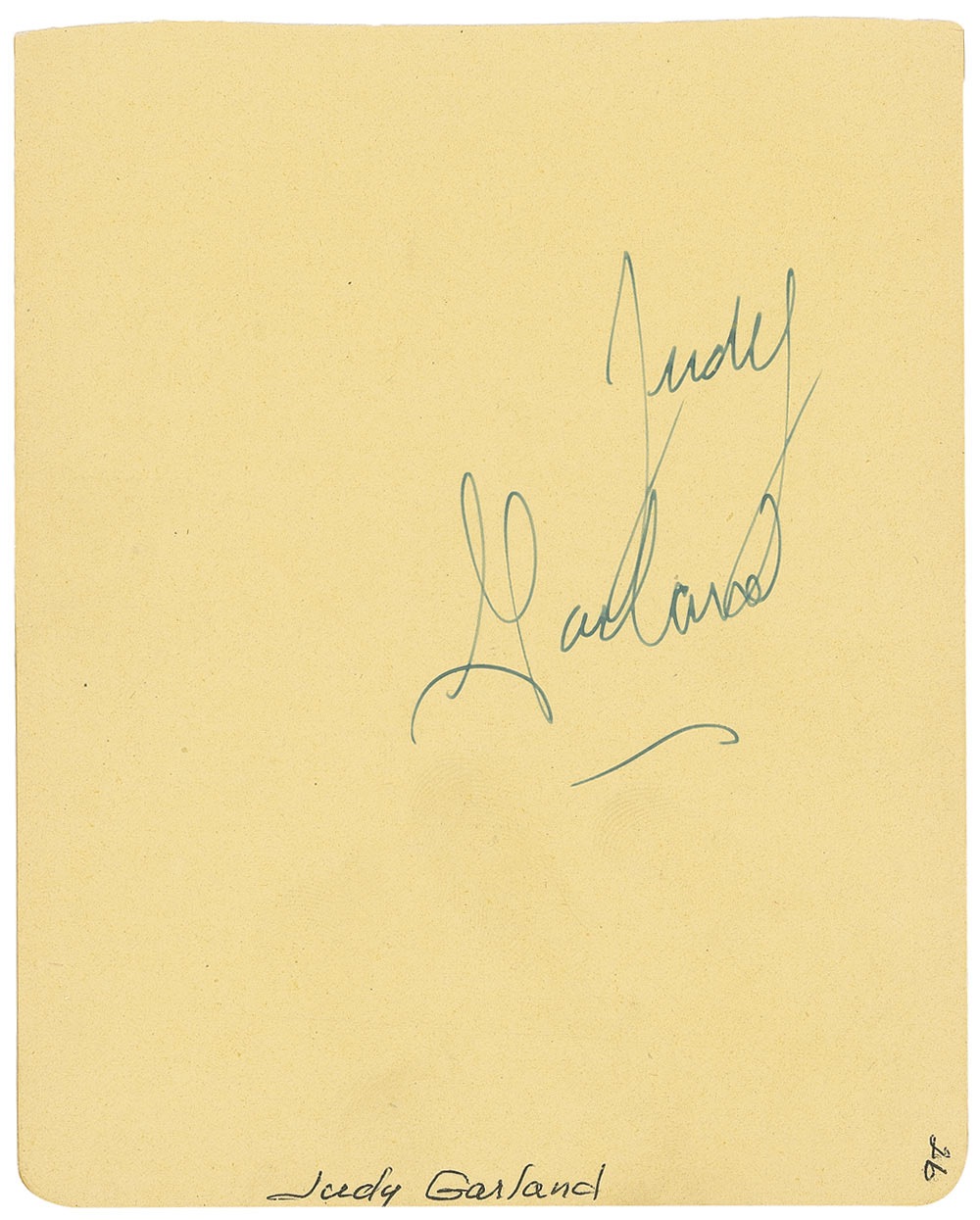 Crisp and pristine vintage fountain pen signature, “Judy Garland,” on a yellow 4.5 x 5.5 album page. In fine condition, with light creasing and a couple ink notations in another hand. Pre-certified PSA/DNA and RR Auction COA.