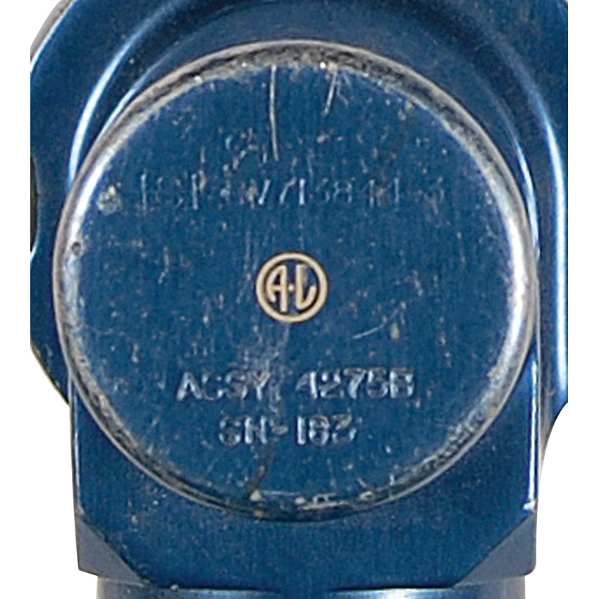 Blue metal space suit connector for an Apollo A7-LB suit. ‘L-shaped’ connector was apparently used during training. In fine condition, with scattered expected wear. RRAuction COA.