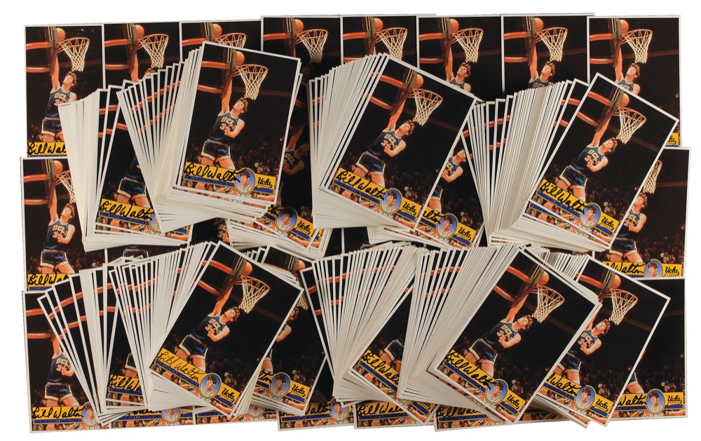 Giant collection of approximately 850 signed cardstock photos, similar to trading cards, each 4 x 6, and all officially licensed by UCLA, depicting Walton hitting a lay-up for UCLA, each signed in black felt tip by Walton. All the photos are housed in two boxes, one of which was labeled and signed by Walton, and reads, “Done, Bill Walton 3-21-97 Orlando!!” In fine overall condition. All photos were signed during a private signing. A huge collection from one of basketball’s most talented and decorated players. RRAuction COA.
