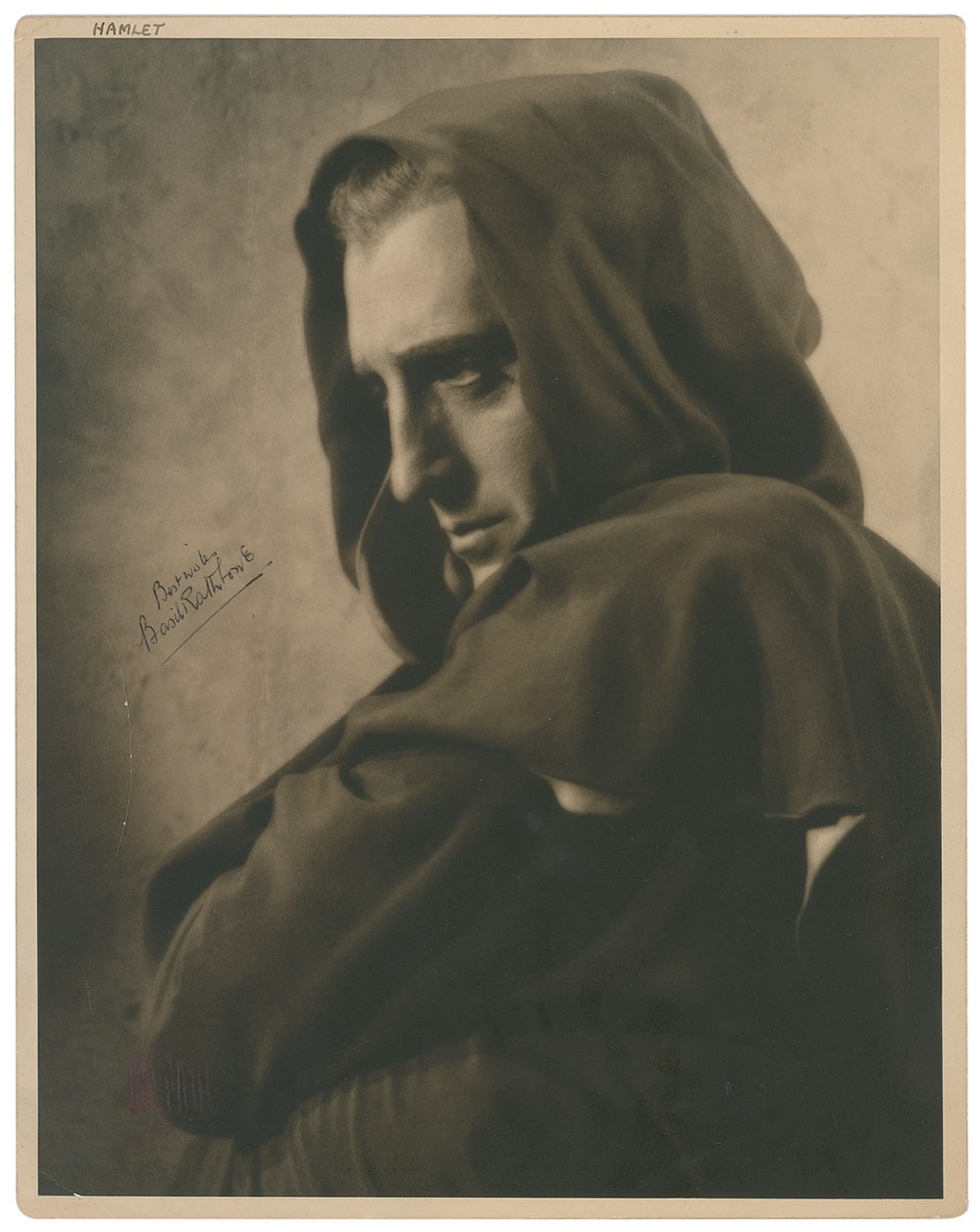 Captivating vintage double-weight matte-finish 11 x 14 Hal Phyfe portrait of Rathbone in the 1916 theatrical production of Hamlet, signed in black ballpoint, “Best Wishes, Basil Rathbone,” and Phyfe signing in red pencil below the image. Some vertical creasing along the left edge, toning, and an ink notation to the top left corner, otherwise fine condition. An exceptional early image of Rathbone from his theatre days. Pre-certified PSA/DNA and RR Auction COA.
