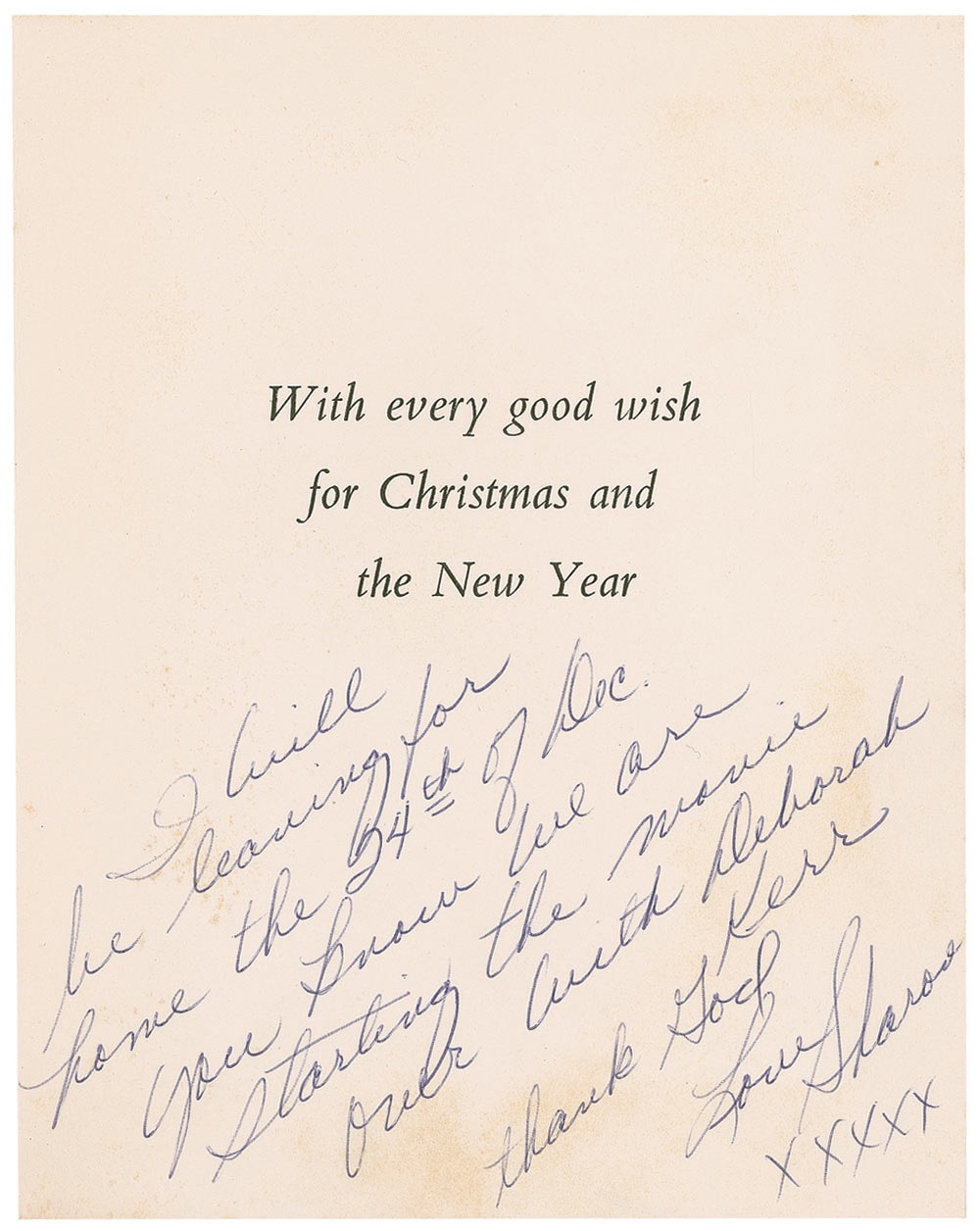Promising American actress (born 1943) and wife of director Roman Polanski who was propelled into infamy when she was murdered by the Manson Family at the age of 26, in the notorious killing spree that shook the nation in the summer of 1969. Christmas card, signed “Love, Sharon xxxxx,” measuring 5.5 x 7 closed, with a color image of The Adoration of the Shepherds on the front cover. Inside bears a pre-printed sentiment, beneath which Tate writes, “I will be leaving for home the 24th of Dec. You know we are starting the movie over with Deborah Kerr. Thank God.” Scattered light creases, and scattered toning to inside of card and back cover, some lightly affecting a few words of note and signature, otherwise fine condition. Tate is referencing her 1966 film Eye of the Devil, starring David Niven and Deborah Kerr. Filmed in 1965, it marked Tate’s first major role in a film. She was cast by Filmways executive Martin Ransohoff, who hailed her as his great discovery. Tate is rare in any form, and any correspondence, particularly regarding her acting, are few and far between. Pre-certified PSA/DNA and RR Auction COA.