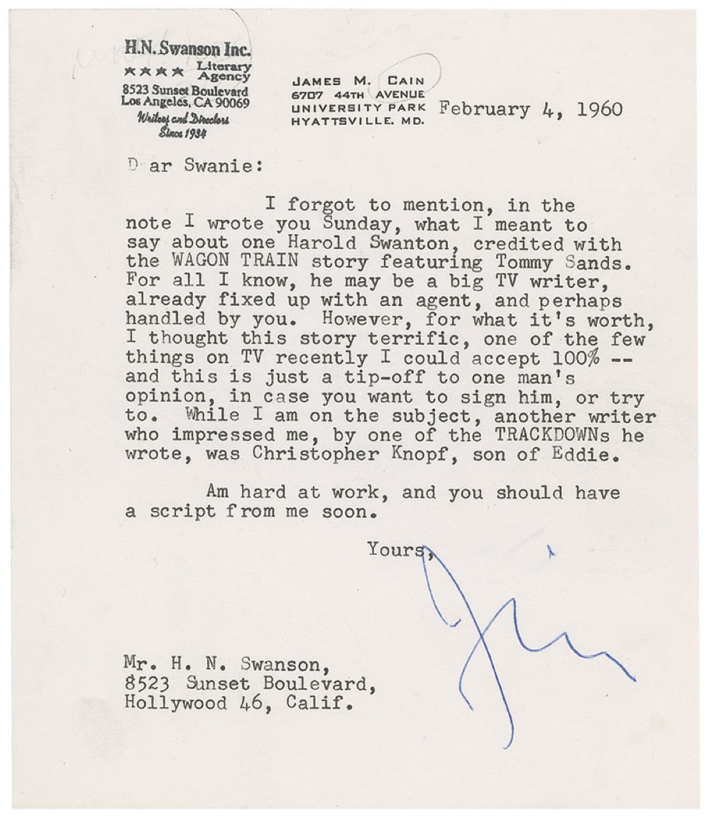 American novelist (1892–1977) best known as the author of such crime/noir classics as The Postman Always Rings Twice and Double Indemnity. TLS signed “Jim,” one page, 6 x 7, personal letterhead, February 4, 1960. Cain writes to H. N. Swanson, the famed Hollywood agent known as “Swanie,” in full: “I forgot to mention, in the note I wrote you Sunday, what I meant to say about Harold Swanton, credited with the Wagon Train story featuring Tommy Sands. For all I know, he may be a big TV writer, already fixed up with an agent, and perhaps handled by you. However, for what it’s worth, I thought this story terrific, one of the few things on TV recently I could accept 100%—and this is just a tip-off to one man’s opinion, in case you want to sign him, or try to. While I am on the subject, another writer who impressed me, by one of the Trackdowns he wrote, was Christopher Knopf, son of Eddie. Am hard at work, and you should have a script from me soon.” Trimmed edges, a few faint pencil notations at the top, and a Swanson stamp to the top left corner, otherwise fine condition. RRAuction COA.