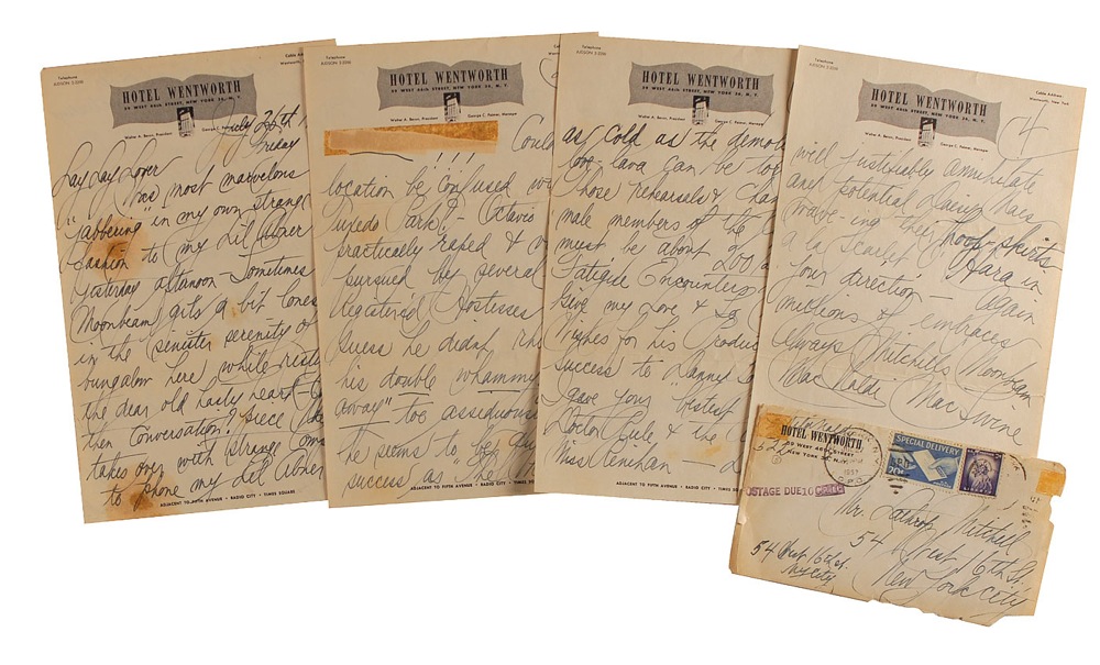 American silent film actress (1894-1961), she appeared with Valentino in Blood and Sand and the silent Dr Jekyll and Mr Hyde. ALS signed “Mitchells Moonbeam Mac Naldi Mac Swine,” four pages both sides, 6 x 9.25, Hotel Wentworth letterhead, July 26, 1957. In a wildly animated letter to her “Lil Abner,” Naldi writes, in part: “Sometimes Moonbeam gets a bit lonesome in the sinister serenity of my bungalow here while resting the dear old Hasty Heart…Naldi takes over with strange compulsions to phone my Lil Abner…Could this location be confused with Tuxedo Park? Octavio was practically raped & violently pursued by several Social Registered Hostesses!??!…he seems to be quite a success as ‘The Man Who came to dinner at Tuxedo Park’ & has so many return engagements that Design for Devastation is driven to restricted schedules with the Merson Mauler—She informed me that she has changed & re-cast the entire ‘caste’ of her ‘Gad Tidings’ production—Several leading men & not leading with their pant’s zippers un-opened—fell by the wayside—Vesuvius’ axe can be as cold as the demolishing love—lava can be torrid…Hope Carl Chases’ blonde number is not giving me interference—heart condition or not will justifiably annihilate any potential Daisy Maes wave-ing their hoop-skirts a al Scarlet O’Hara…” Uniform toning, scattered areas of soiling, a strip of adhesive remnants along the top of the second page, and a few small areas of separation along the horizontal mailing folds, with one passing between the two lines of the signature, otherwise very good condition. Accompanied by the original mailing envelope, addressed in Naldi’s hand and signed in the return address area. Pre-certified PSA/DNA and RR Auction COA.