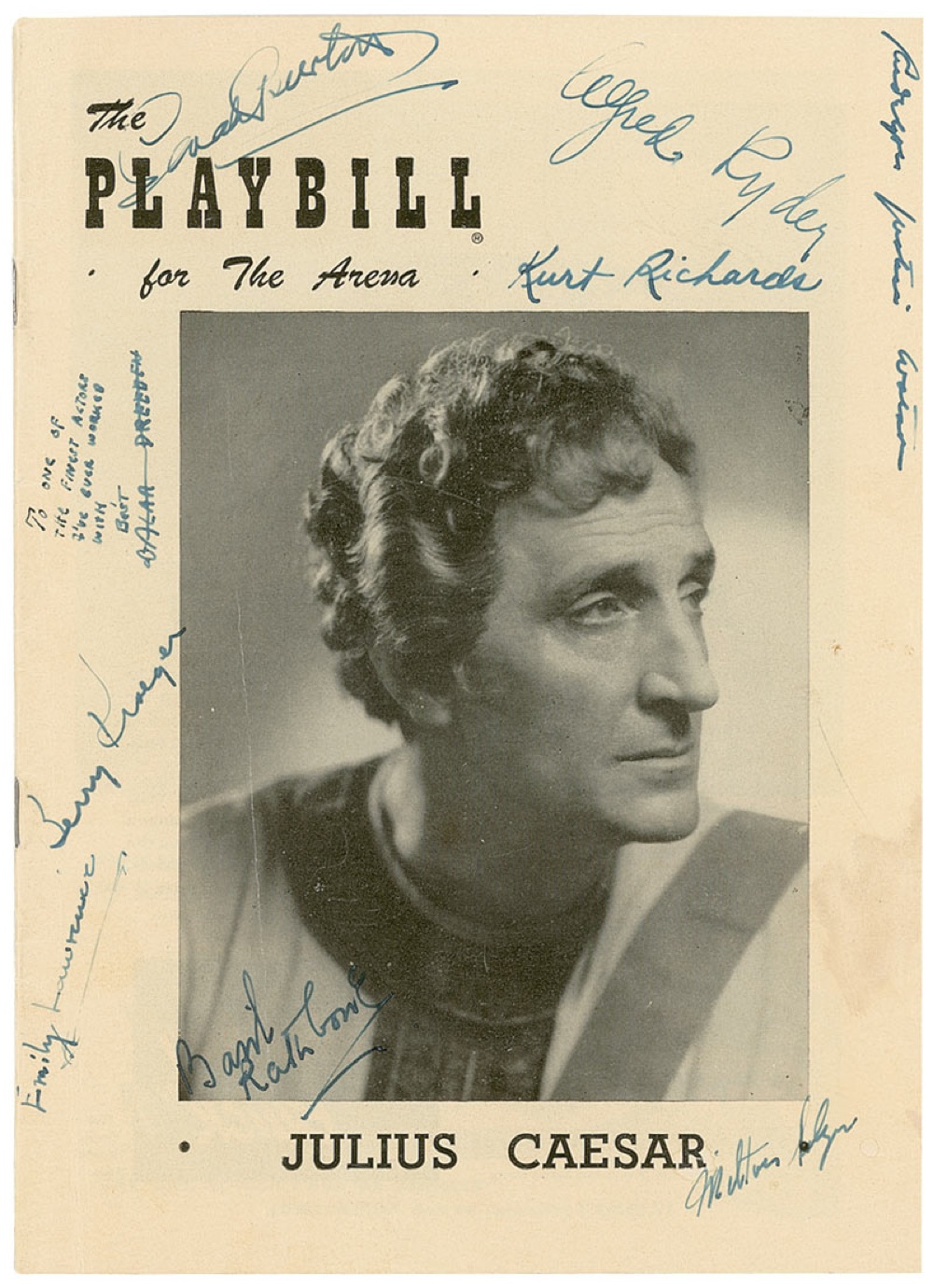 Vintage playbill for The Arena’s production of Julius Caesar, signed on the cover in fountain pen, “Basil Rathbone,” and seven other cast members. In very good condition, with a vertical crease passing through two letters of Rathbone’s signature, uniform toning, a small, darker area along the right edge, and a cardstock mount of the same size affixed to the back cover. Pre-certified PSA/DNA and RR Auction COA.