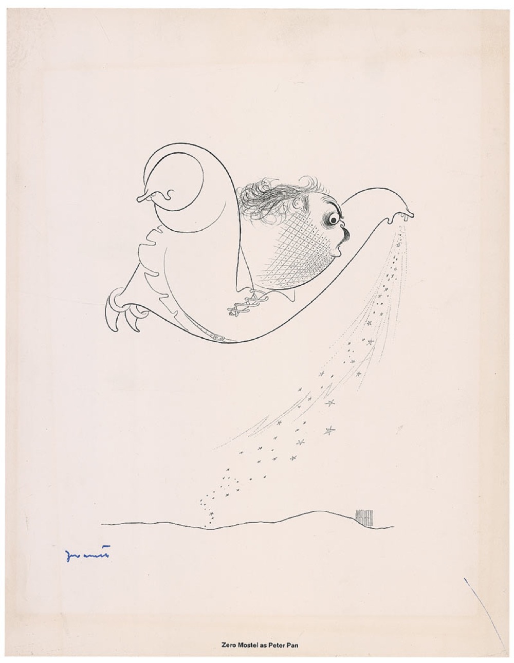 Two identical Hirschfeld prints of Mostel as Peter Pan, 11 x 14, one signed in blue ink and the other signed in black ink below the images, “Zero Mostel.” In fine condition, with a frame of light toning to one, and uniform toning to the other, with some trivial corner creases. RRAuction COA.