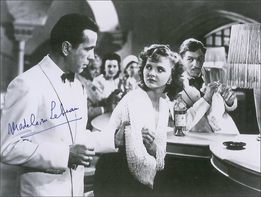Classic glossy 10 x 8 jet-print photo of LeBeau and Humphrey Bogart in Casablanca, signed in blue felt tip by LeBeau. In fine condition, with a faint grainy horizontal strip, lightly passing through the bottom of LeBeau’s facial area. Pre-certified PSA/DNA and RR Auction COA.
