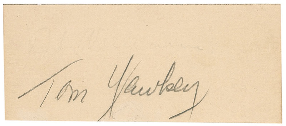 Vintage pencil signature, “Tom Yawkey,” on an off-white 4.25 x 1.75 slip. In fine condition, with closely clipped bottom edge, some mild toning, and light remnants of an erased signature above Yawkey’s. Pre-certified Steve Grad/PSA/DNA and RR Auction COA.