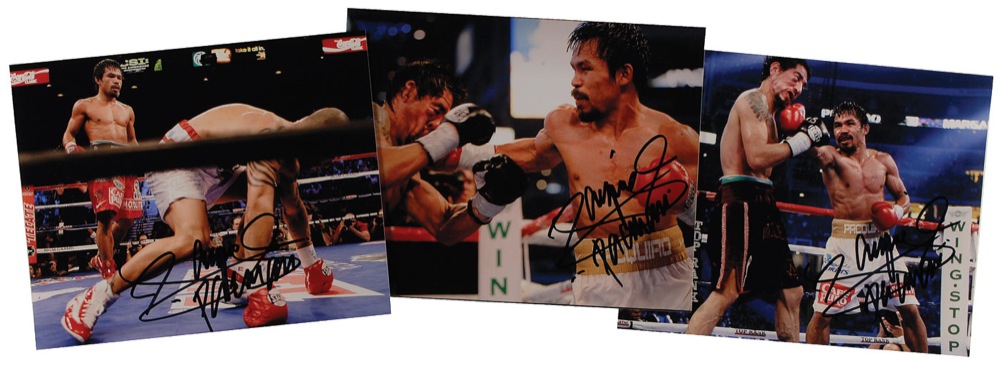 Three satin-finish 10 x 8 photos of Pacquiao in the ring against two different opponents, each signed in black felt tip. In fine condition. RRAuction COA.