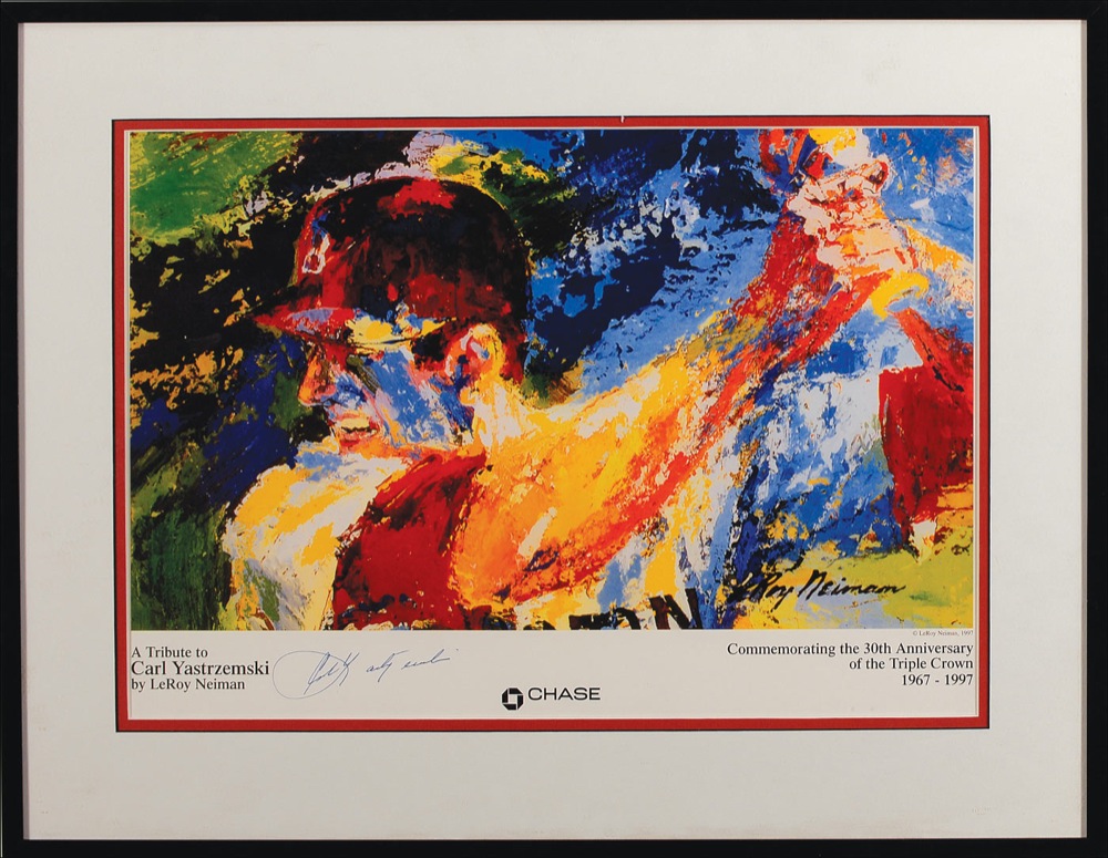 Color 17 x 11.75 lithograph entitled A Tribute to Carl Yastrzemski by Leroy Neiman, Commemorating the 30th Anniversary of the Triple Crown 1967–1997, signed in blue ballpoint, “Carl Yastrzemski.” Double-matted and framed to an overall size of 17.25 x 22.75. In fine condition. Pre-certified Steve Grad/PSA/DNA and RR Auction COA.
