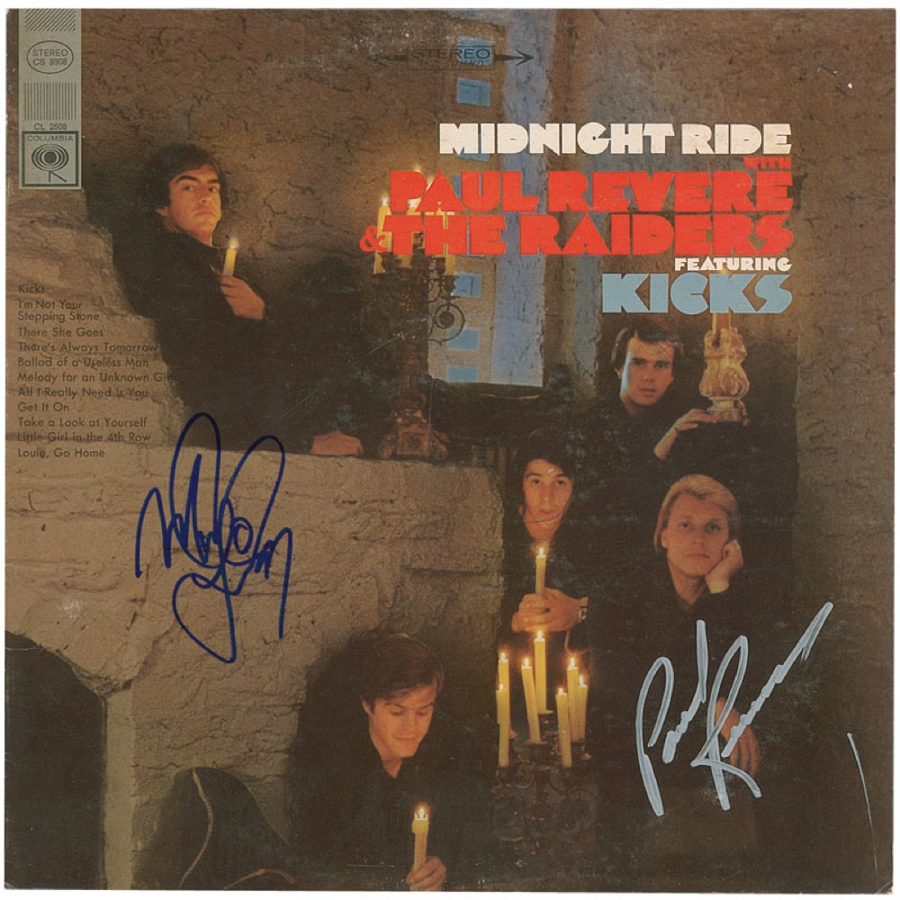 Two albums: Midnight Ride, signed in silver ink by Paul Revere and in blue felt tip by Mark Lindsay; and Once Upon a Dream, signed on the front cover in blue felt tip by Felix Cavaliere. The records are included. In fine condition, with a discount cut and corner wear to the Rascals’ album. RRAuction COA.