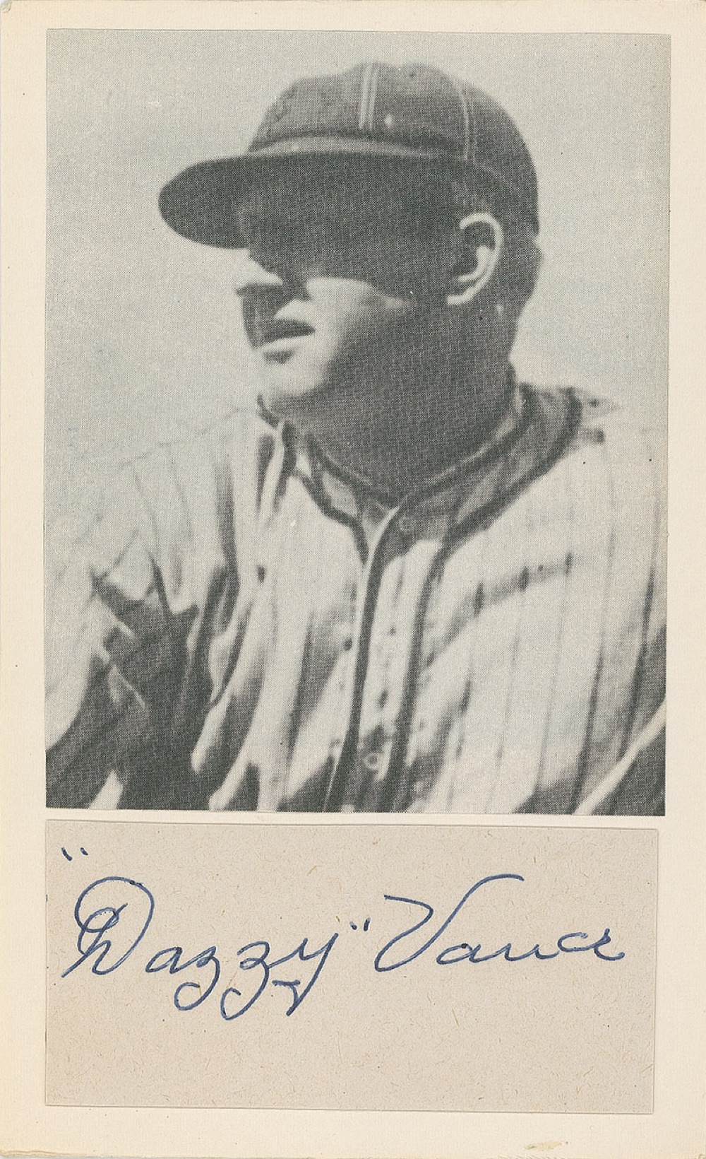 Baseball Hall of Famer (1891–1961) who was the dominant National League pitcher of the 1920s. Ballpoint signature, “’Dazzy’ Vance,” on an off-white 3 x 1.5 card. Card is affixed to the lower portion of an off-white 3.5 x 6 card with a clipped photo of Vance affixed above. In fine condition. Pre-certified Steve Grad/PSA/DNA and RR Auction COA.