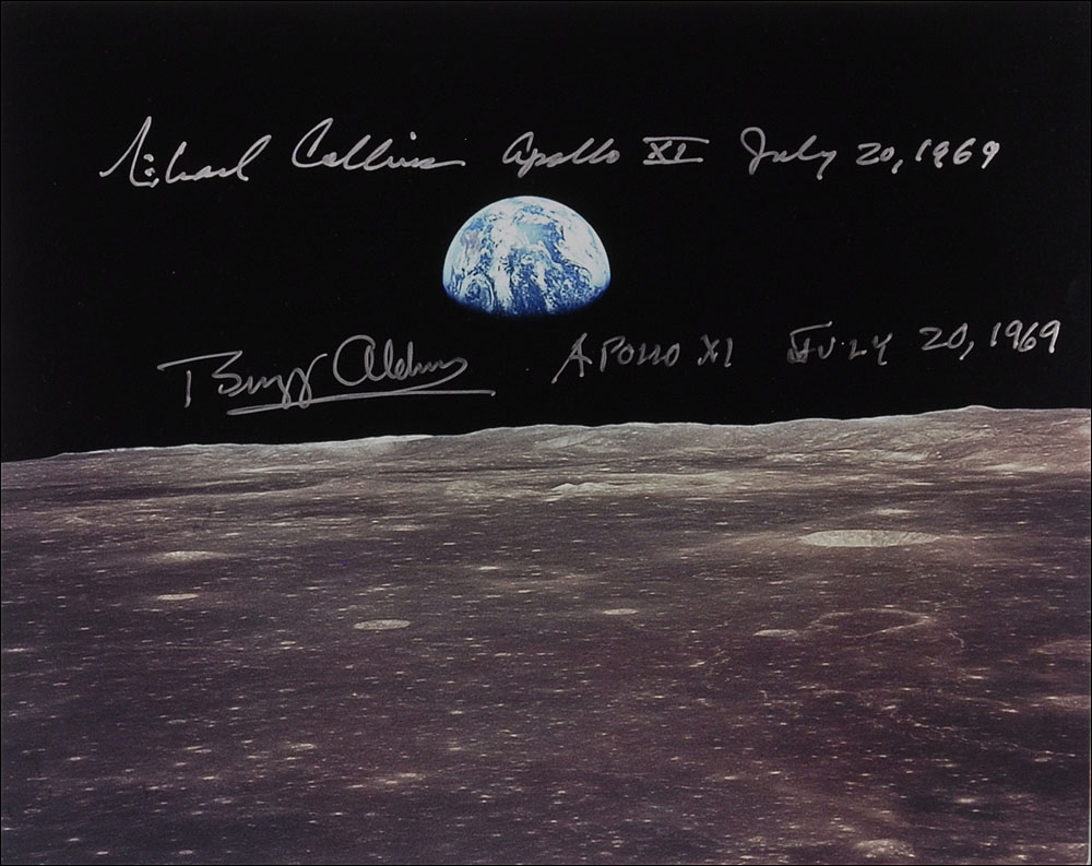 Breath-taking color satin-finish 10 x 8 photo of the earthrise over the lunar horizon, signed in silver ink, “Buzz Aldrin, Apollo XI, July 20, 1969,” and “Michael Collins, Apollo XI, July 20, 1969.” In very fine condition. Accompanied by a certificate of authenticity from Novaspace for Collins and a photo of Aldrin taken at time of signing. Pre-certified Steve Zarelli and RR Auction COA.