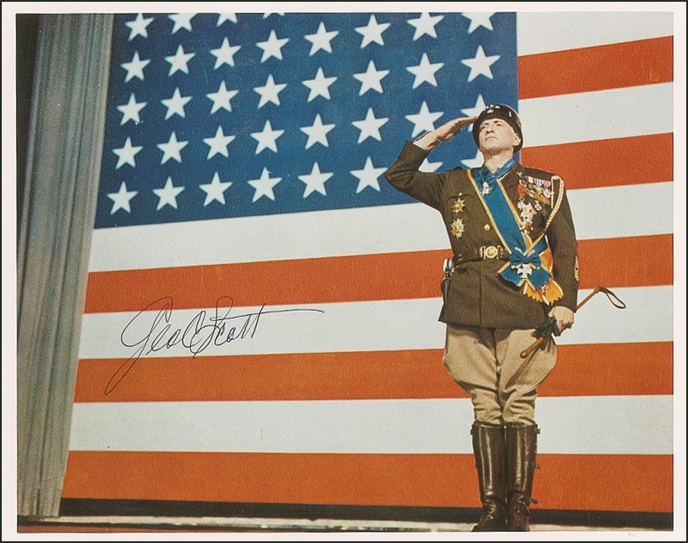 Color satin-finish 10 x 8 photo of Scott in his Academy Award-winning role as Patton, signed in black ballpoint. In fine condition. Pre-certified PSA/DNA and RR Auction COA.