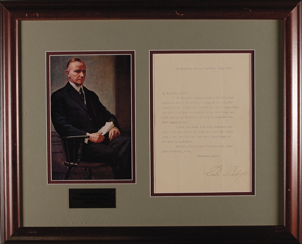 TLS, one page, 7 x 9.75, September 27, 1915. Coolidge sends thanks to a committee for their support of him and the Republican Party. In part: “I want you to know how much I appreciate the kind words you have spoken of me, and I hope you will express my thanks to any of your neighbors who have supported me. I wish you would tell your Committee members—the men who do the work and stand the criticism—that the time has come when Republicans do not have to apologize.” Double matted and framed with a color portrait and a small plaque to an overall size of 22 x 18. In fine condition, with intersecting mailing folds, one through a single letter of signature, and a mild shade of toning. Pre-certified John Reznikoff/PSA/DNA and RR Auction COA.