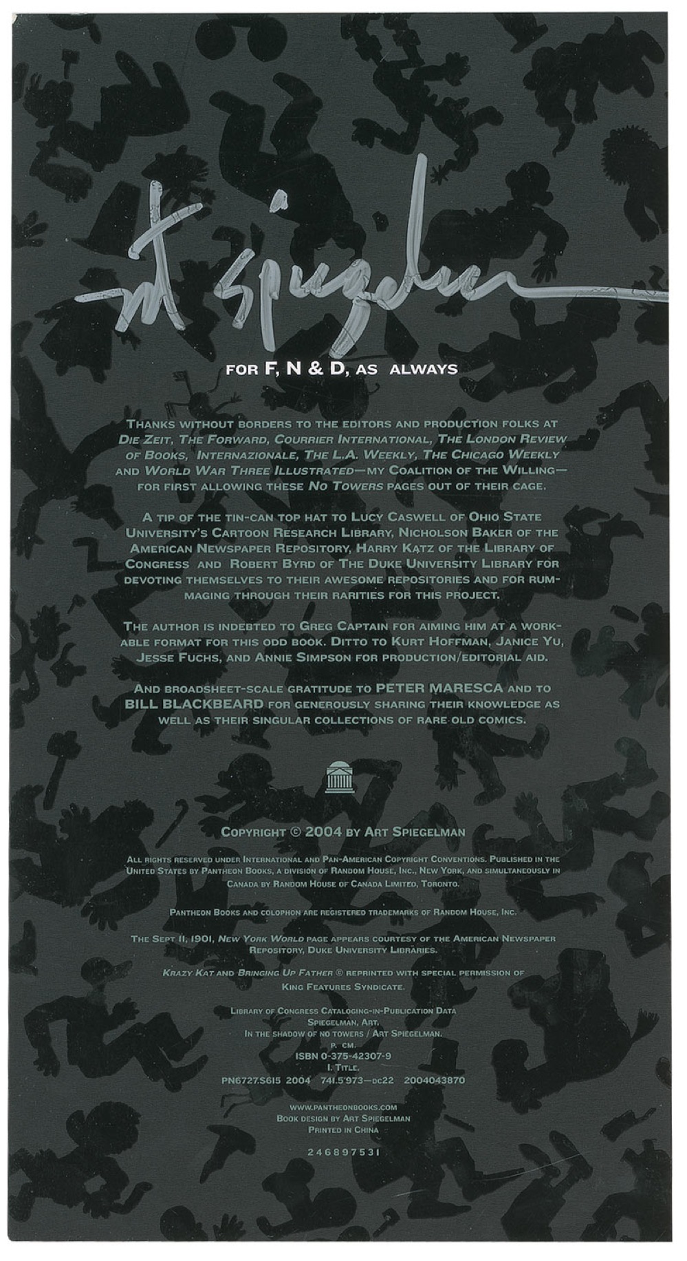 Signed book: In the Shadow of No Towers. First edition, first printing. NY: Pantheon Books, 2004. Hardcover, 10 x 14.5. Signed on the inside front cover in silver ink. In very good condition, with surface marks, scratches, dings, and impressions, mainly to front cover, as well as a couple areas of surface loss to front cover. RRAuction COA.