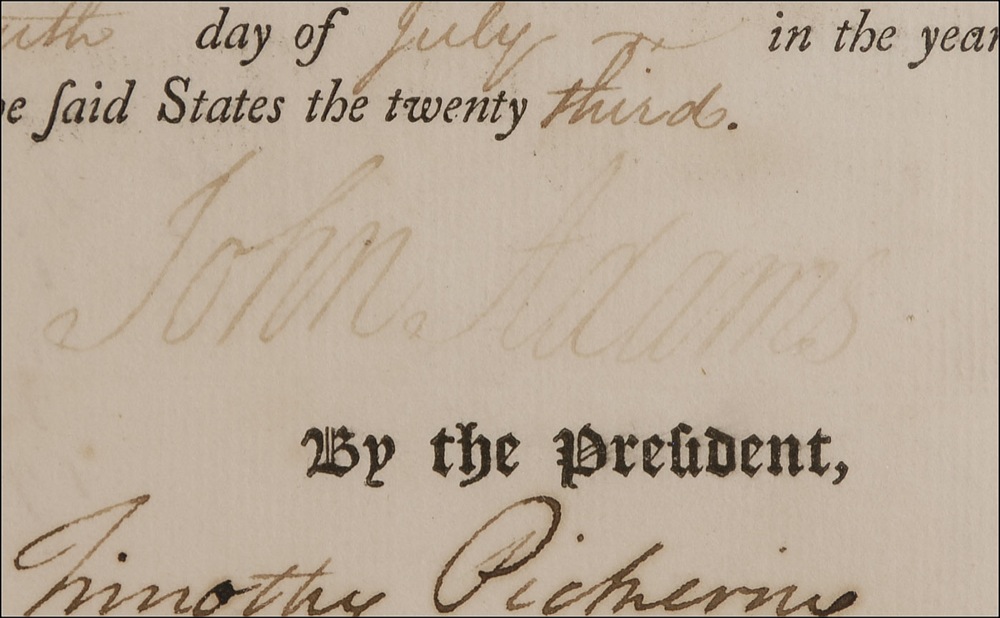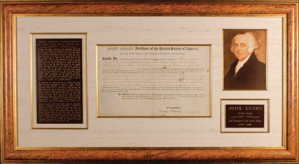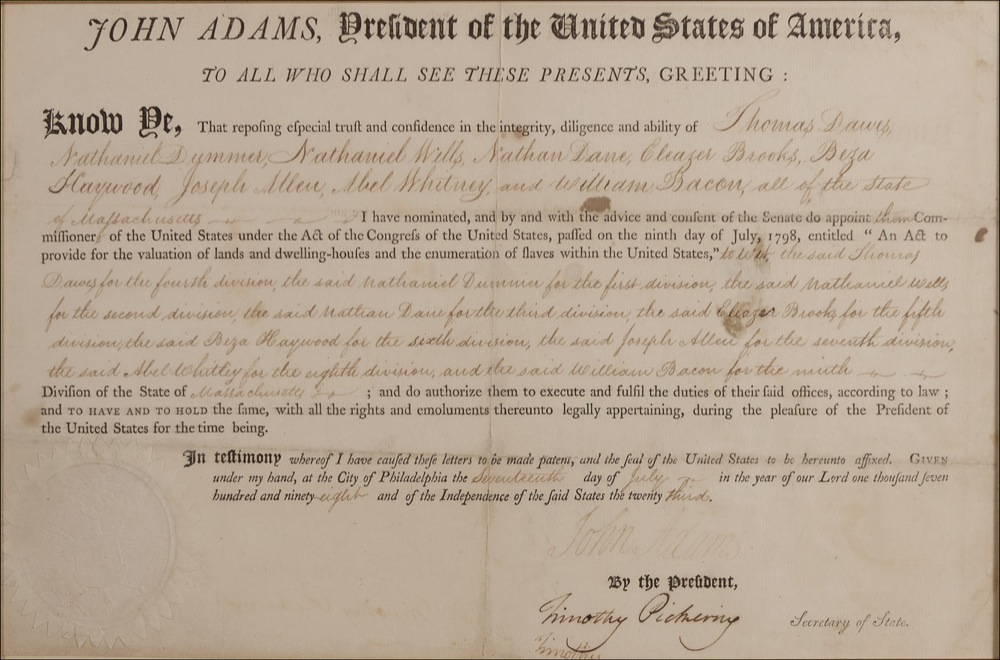 Partly-printed DS as president, one page, 14.5 x 9, July 17, 1798. Adams appoints “Thomas Dawes, Nathaniel Dummers, Nathaniel Wells, Nathan Lane, Eleazer Brooks, Beza Haywood, Joseph Allen, Abel Whitney, and William Bacon, all of the State of Massachusetts…Commissioners of the United States under the Act of Congress of the United States passed on the ninth day of July, 1798, entitled ‘An Act to provide for the valuation of lands and dwelling-houses and the enumeration of slaves within the United States.” Signed at the conclusion by Adams, and countersigned by Secretary of State Timothy Pickering. Beautifully cloth matted and framed by the Gallery of History with a portrait of Adams and two descriptive plaques to an overall size of 39 x 21.5. In very good condition, with intersecting folds, some of which appear to have had some professional repairs or reinforcement, scattered toning and soiling, and Adams’s signature fairly light, but still legible. The white wafer seal is toned, but intact.