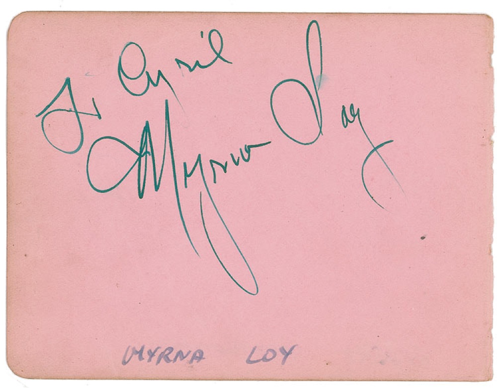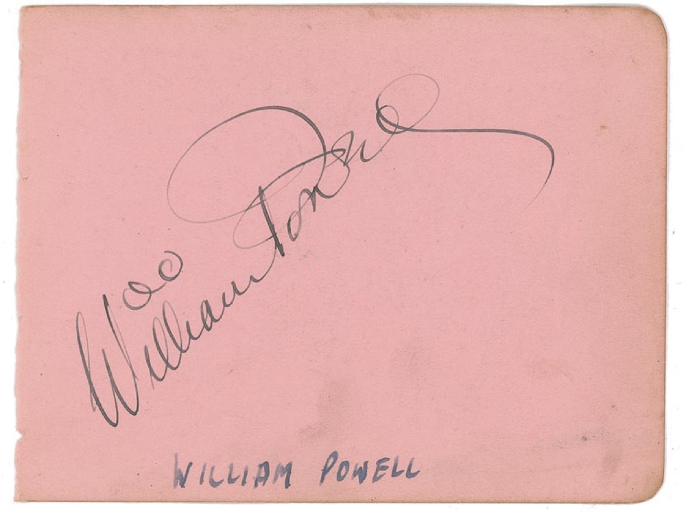 Two signatures: florid fountain pen signature, “William Powell,” on a pink 5 x 4 album page; and a green fountain pen signature and inscription, “To Cyril, Myrna Loy,” on a pink 5 x 4 album page. In very good condition, with light creasing, uniform toning with heavier areas along the edges, some trivial soiling, and ink notations to both. RRAuction COA.