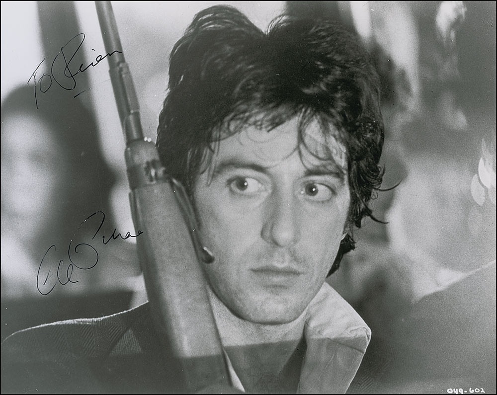 Vintage glossy 10 x 8 publicity photo from Dog Day Afternoon, signed and inscribed in-person in fountain pen, “To Pierre, Al Pacino.” In fine condition, with slightly irregular ink adhesion to the signature. Pre-certified PSA/DNA and RR Auction COA.