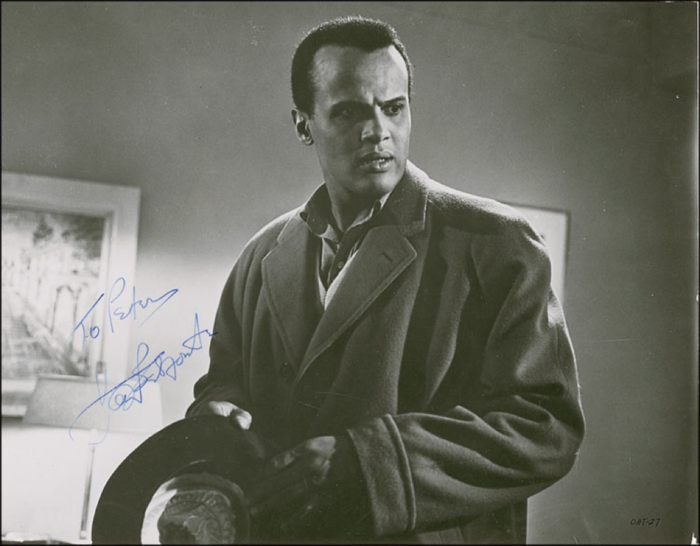Vintage glossy 9.5 x 7.5 publicity photo of Belafonte in the 1959 film, Odds Against Tomorrow, signed and inscribed in-person in fountain pen, “To Peter, Harry Belafonte.” A couple crease, some trivial surface marks and trimmed edges, otherwise fine condition. Pre-certified PSA/DNA and RR Auction COA.