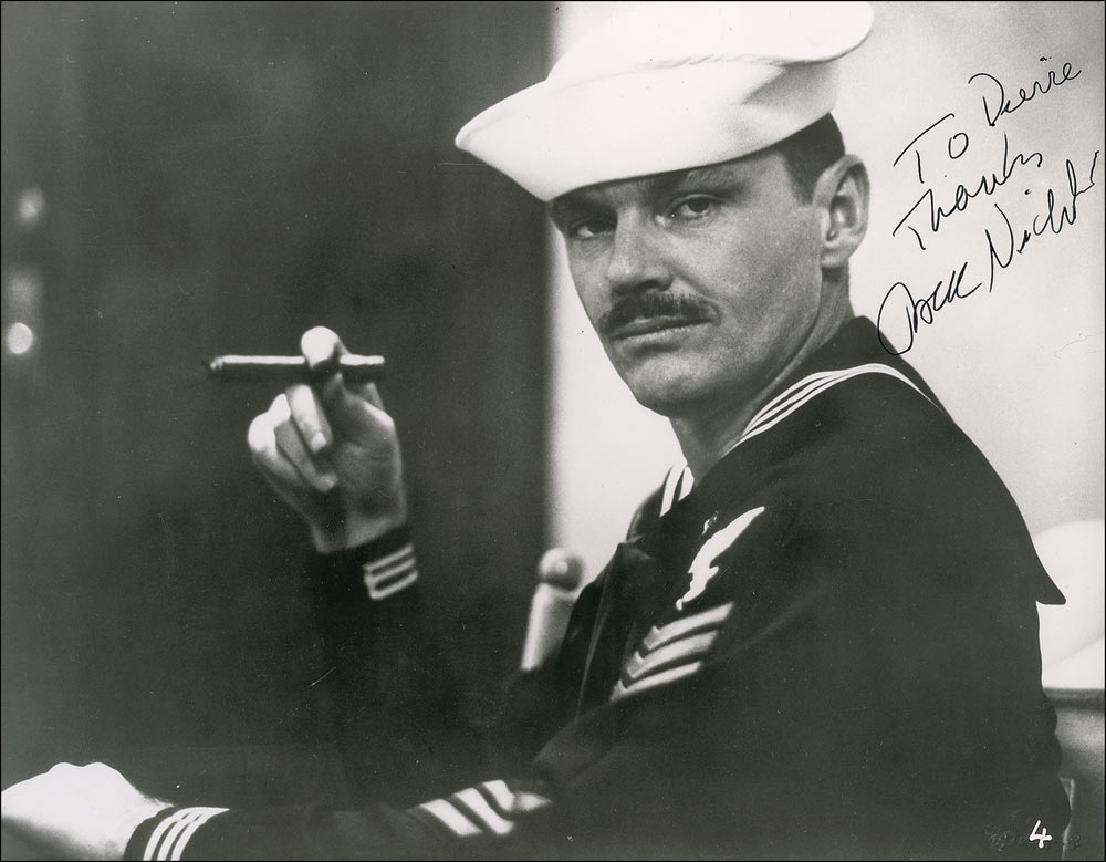 Fantastic vintage glossy 10 x 8 publicity photo of Nicholson from The Last Detail, signed and inscribed in-person in fountain pen, “To Pierre, Thanks, Jack Nicholson.” In fine condition, with scattered light creasing and some light rippling to emulsion. Pre-certified PSA/DNA and RR Auction COA.