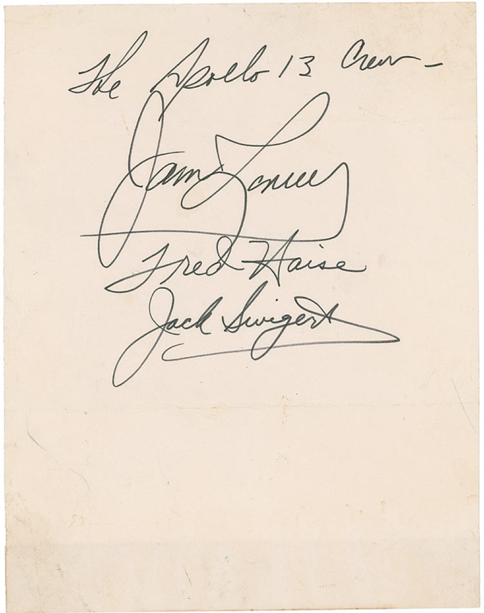 Bold felt tip signatures, “The Apollo 13 Crew—James Lovell,” “Fred Haise,” and “Jack Swigert,” on an off-white 6.25 x 8 sheet. In fine condition, with horizontal fold below signatures, and some mild toning and wrinkling. Pre-certified Steve Zarelli and RR Auction COA.