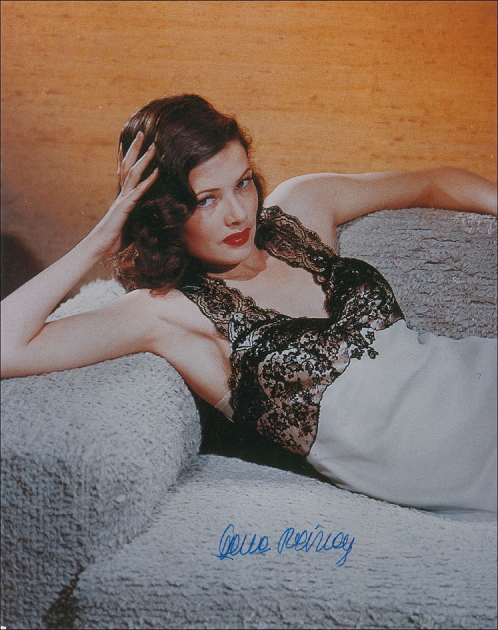 Color satin-finish 8 x 10 photo of the sultry actress lounging in a lacey dress, signed in blue felt tip, “Gene Tierney.” In fine condition. Pre-certified PSA/DNA and RR Auction COA.