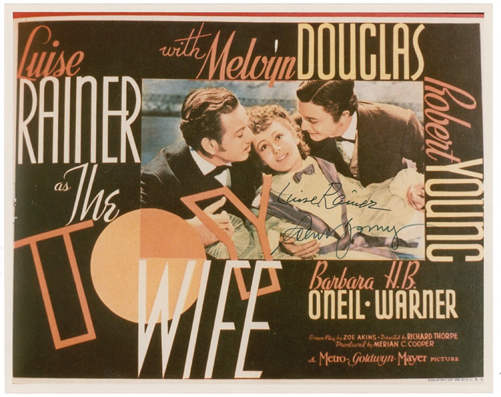 Color glossy 10 x 8 photo of a lobby card for The Toy Wife, signed in black felt tip, “Luise Rainer” and “Robert Young.” In fine condition, with a faint paperclip impression to the left edge. Pre-certified PSA/DNA and RR Auction COA.