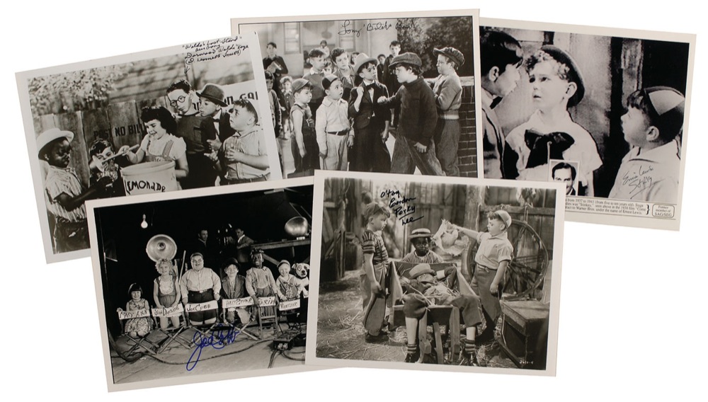 Five different images of varying finishes, each measuring approximately 10 x 8, all depicting scenes and characters from the famed series, Our Gang and Little Rascals, and each signed in felt tip by a respective actor. Signers are: Joe Cobb, Tommy ‘Butch’ Bond, Gordon ‘Porky’ Lee, Darwood ‘Waldo’ Kaye, and Ernest L. Weckbaugh. In fine condition, with a bit of a grainy quality to Weckbaugh’s image. RRAuction COA.