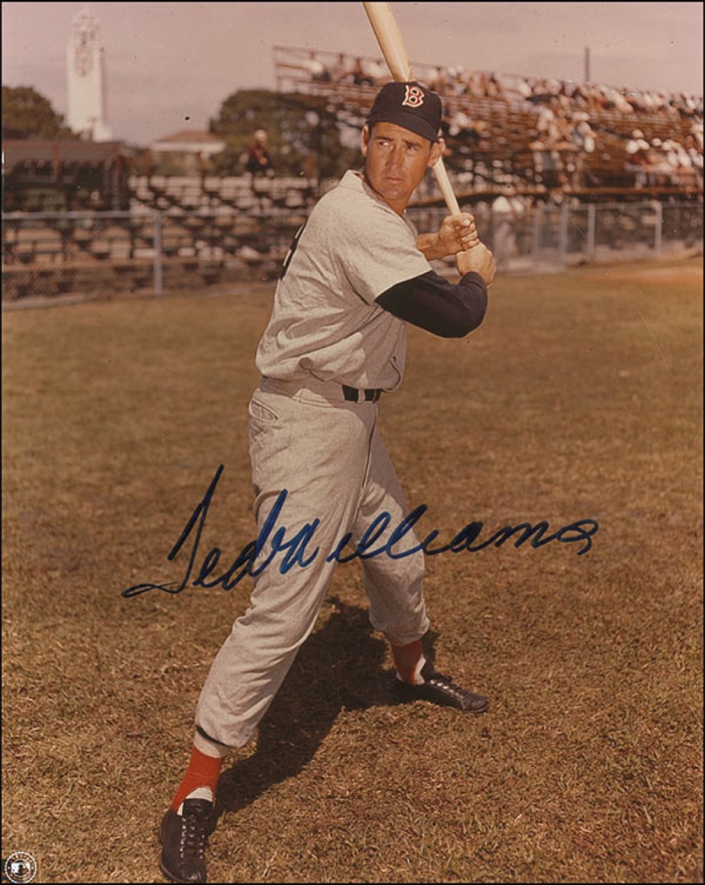 Color glossy 8 x 10 photo of Williams holding a batters’ stance in his Red Sox uniform, signed boldly in blue felt tip, “Ted Williams.” In fine condition, with a few trivial surface dings. Pre-certified Steve Grad/PSA/DNA and RR Auction COA.