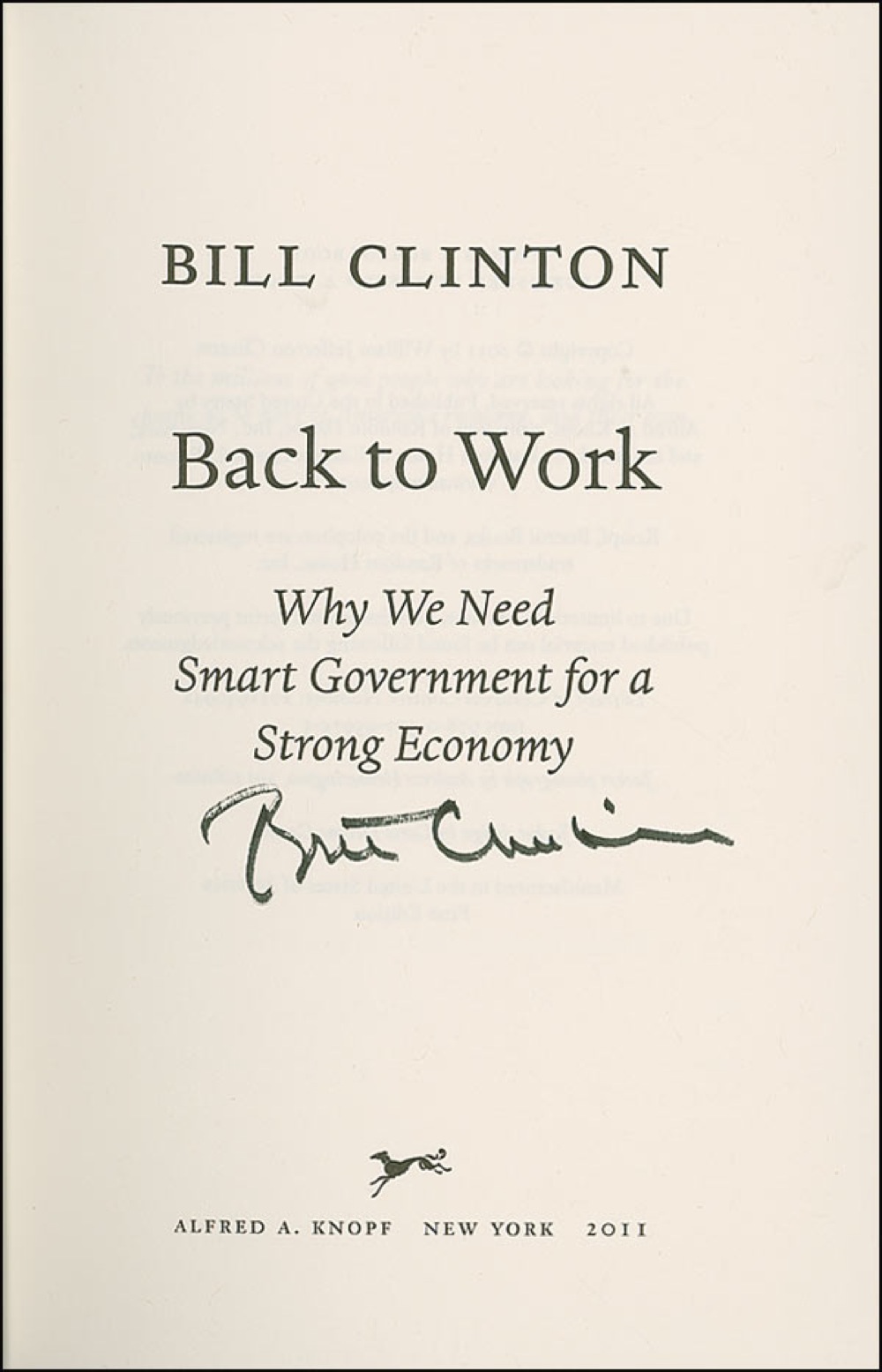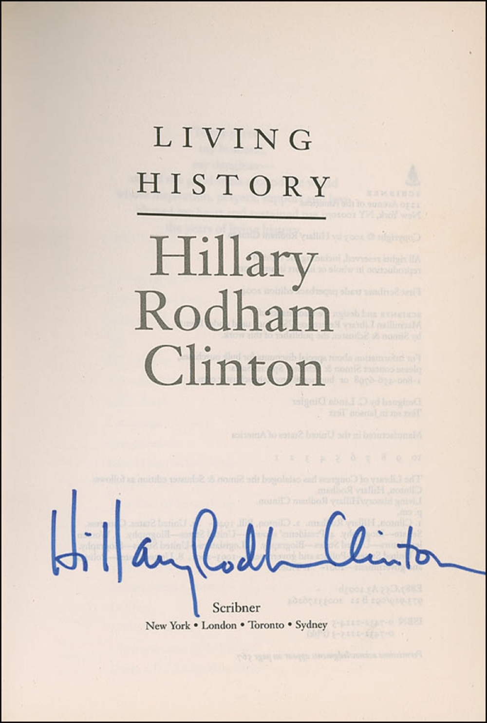 Two books: a hardcover first edition of Back to Work, signed on the title page in black felt tip by Bill Clinton; and a softcover edition of Living History, signed on the title page in blue felt tip, “Hillary Rodham Clinton.” In fine condition, with some light wear to Hillary’s cover. Pre-certified PSA/DNA and RR Auction COA.
