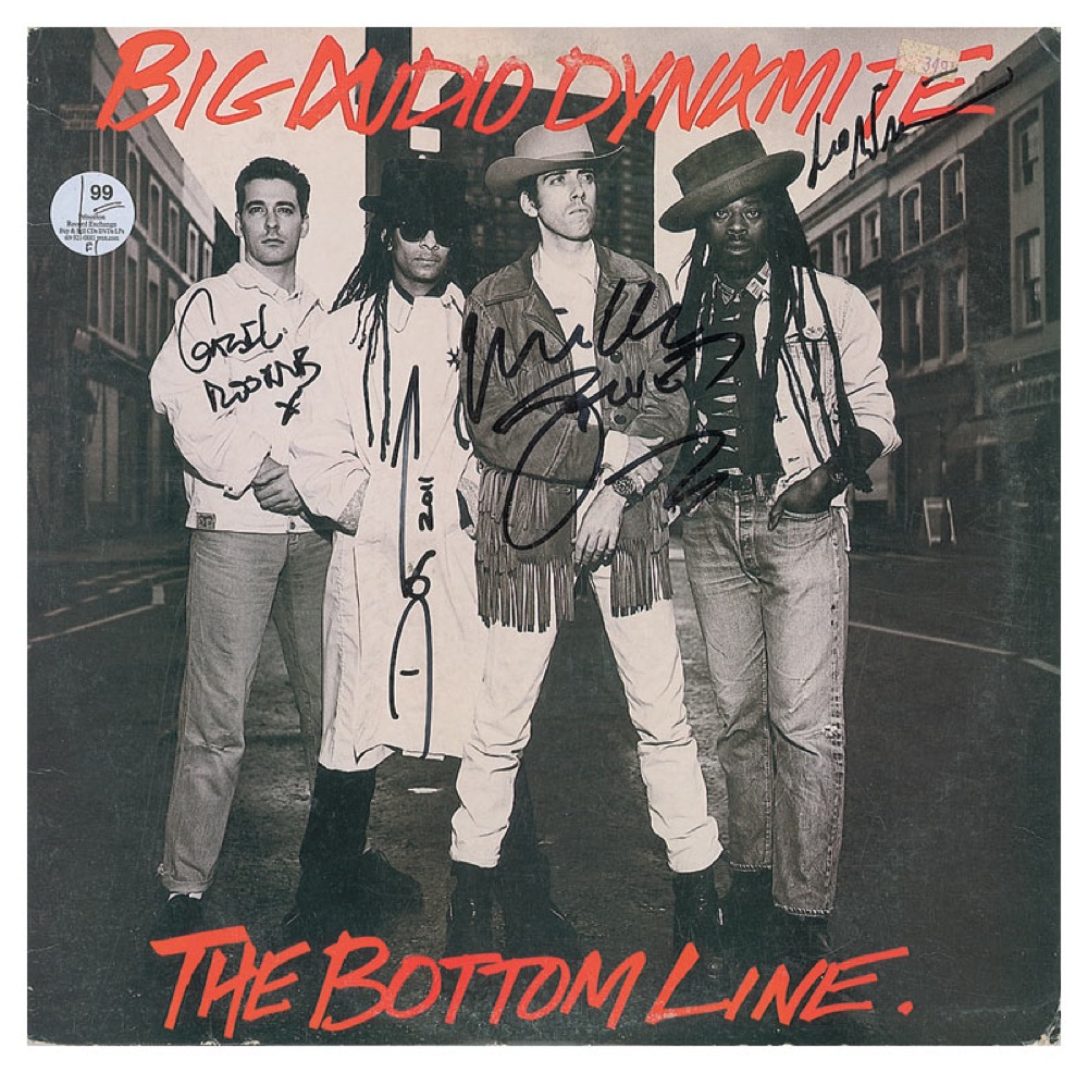 The Bottom Line album signed on the front in black felt tip by Mick Jones, Don Letts, Greg Roberts, and Leo Williams. Light corner wear, two price stickers to the front cover, and light ‘rings of wear,’ otherwise fine condition. The record is included. RRAuction COA.