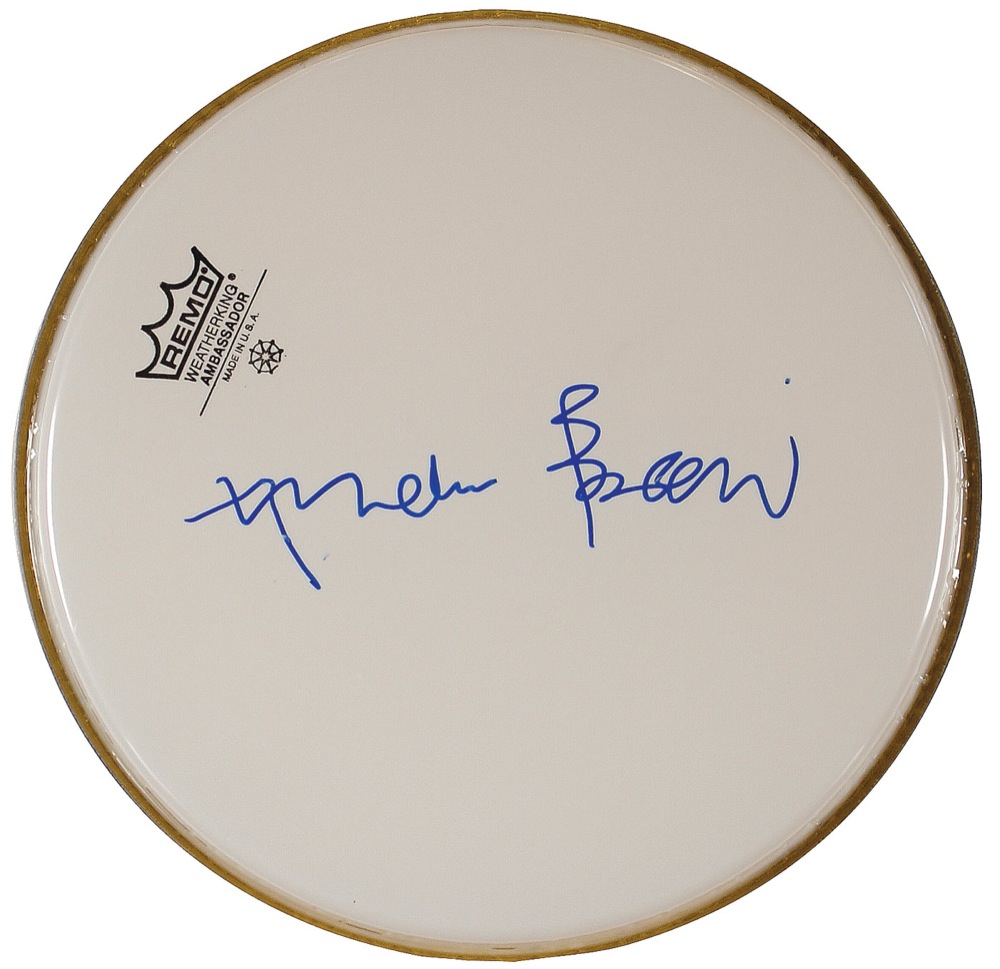 White unused 10″ Remo drumhead, signed in blue felt tip, “Andrea Bocelli.” In fine condition, with a trivial smudge to the first letter of the signature. RRAuction COA.