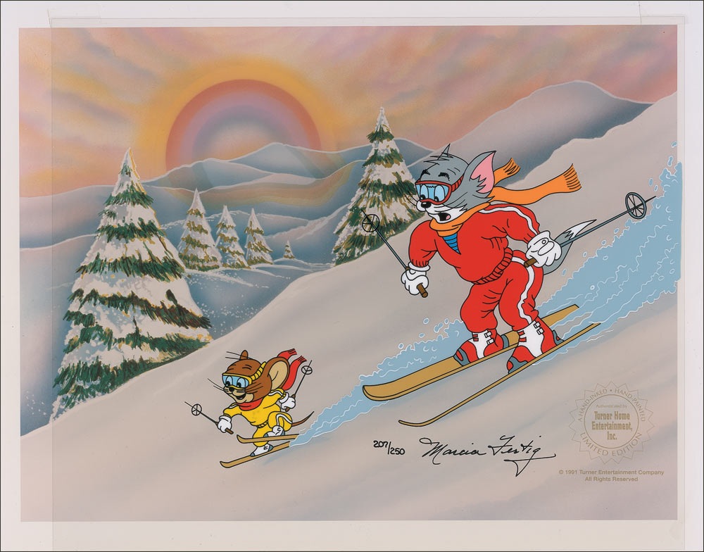 Limited edition hand-painted animation cel, #207/250, 14 x 11, showing Tom and Jerry skiing down snowy slopes. Cel bears a 1991 Turner Home Entertainment, Inc. limited edition gold stamp. Signed in black felt tip by Fertig, and set against a pre-printed color satin-finish background. In fine condition. RRAuction COA.