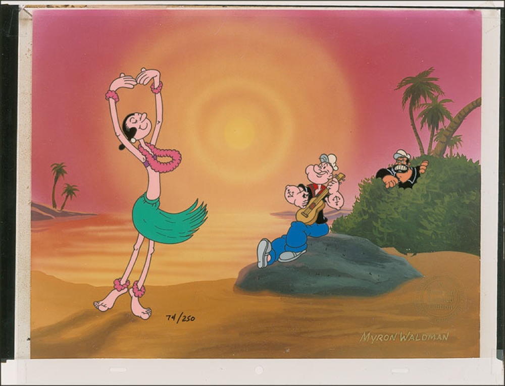 Limited edition hand-painted animation cel, #74/250, 13.5 x 10.25, featuring Popeye playing a guitar on the beach for Olive Oyl to hula, while Bluto angrily peeks out from a bush in the background. Cel bears a 1990 Toon Limited Art Edition gold stamp. Signed in gold ink by Waldman, and set against a pre-printed color satin-finish background. In fine condition. RRAuction COA.