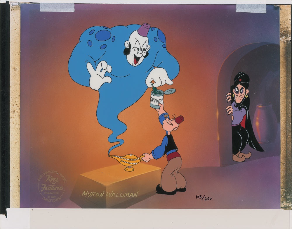 Limited edition hand-painted animation cel, #103/250, 12.5 x 10.5, picturing Popeye handing a genie a can of spinach while an angry villain looks on. Signed in gold ink by Waldman, and set against a pre-printed color glossy-finish background. Cel bears a 1990 King Features Syndicate Inc. limited edition gold stamp. In fine condition, with some slight chipping to the signature. RRAuction COA.