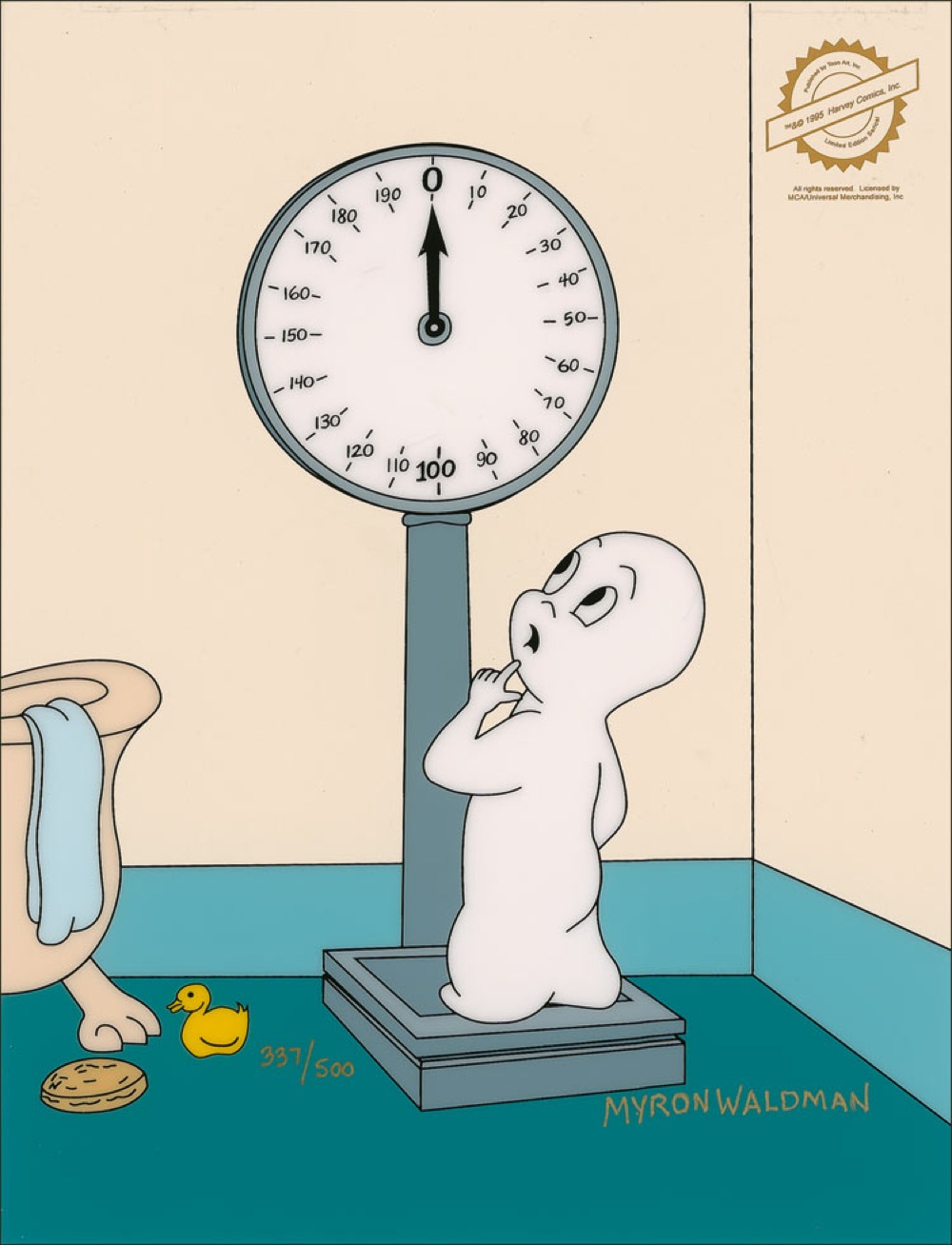 Limited edition sericel, #337/500, 10.75 x 14, featuring Casper weighing himself on an oversized scale, which, to his surprise, is pointing to zero. Signed in gold ink by Waldman, and set against a pre-printed color matte-finish background. Cel bears a 1995 Harvey Comics, Inc. limited edition gold stamp. In fine condition. RRAuction COA.