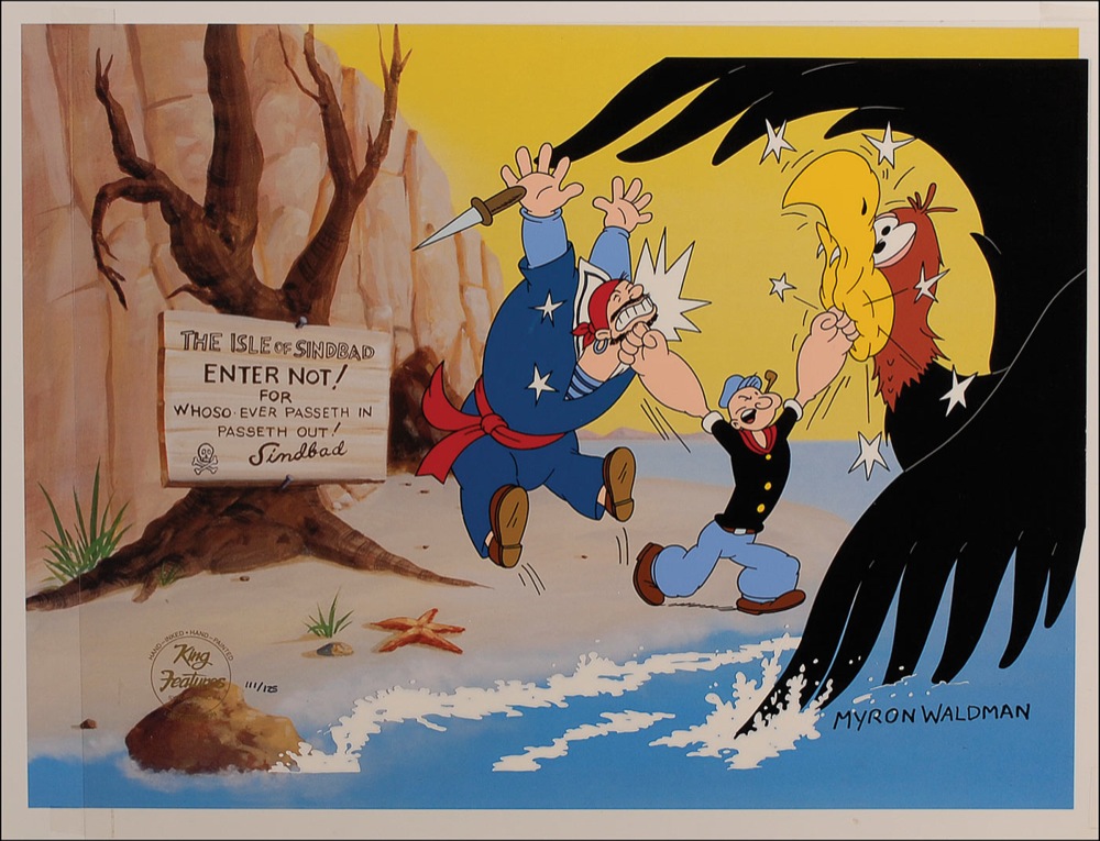 Limited edition hand-painted animation cel, #111/125, 16.5 x 13.25, entitled ‘Popeye the Sailor Meets Sinbad the Sailor,’ as Popeye serves simultaneous fistfuls to Sinbad and a large vulture. Signed in black felt tip by Waldman, and set against a pre-printed color satin-finish background. Cel bears a 1997 King Features Syndicate Inc. limited edition gold stamp. In fine condition. RRAuction COA.