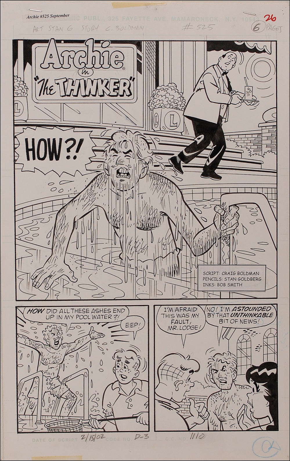 Original artwork for a 31-panel Archie comic #525 story titled “The Thinker,” on six 11.5 x 17.5 sheets of artist’s cardstock, dated February 15, 2002. This is the complete original artwork for the story, inked by Goldberg and shows Archie trying to be a preventative thinker, with the expected results. Included is a photocopy of the entire comic, signed in black felt tip, “This is my original pencil art for #525—Stan Goldberg.” In fine condition. RRAuction COA.