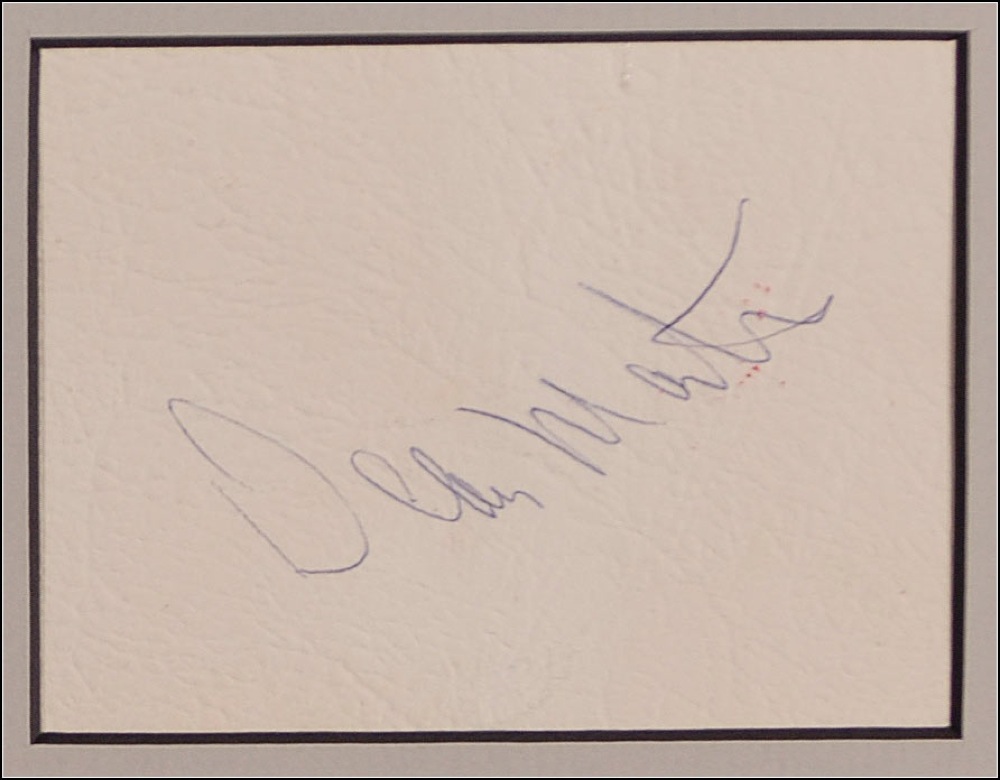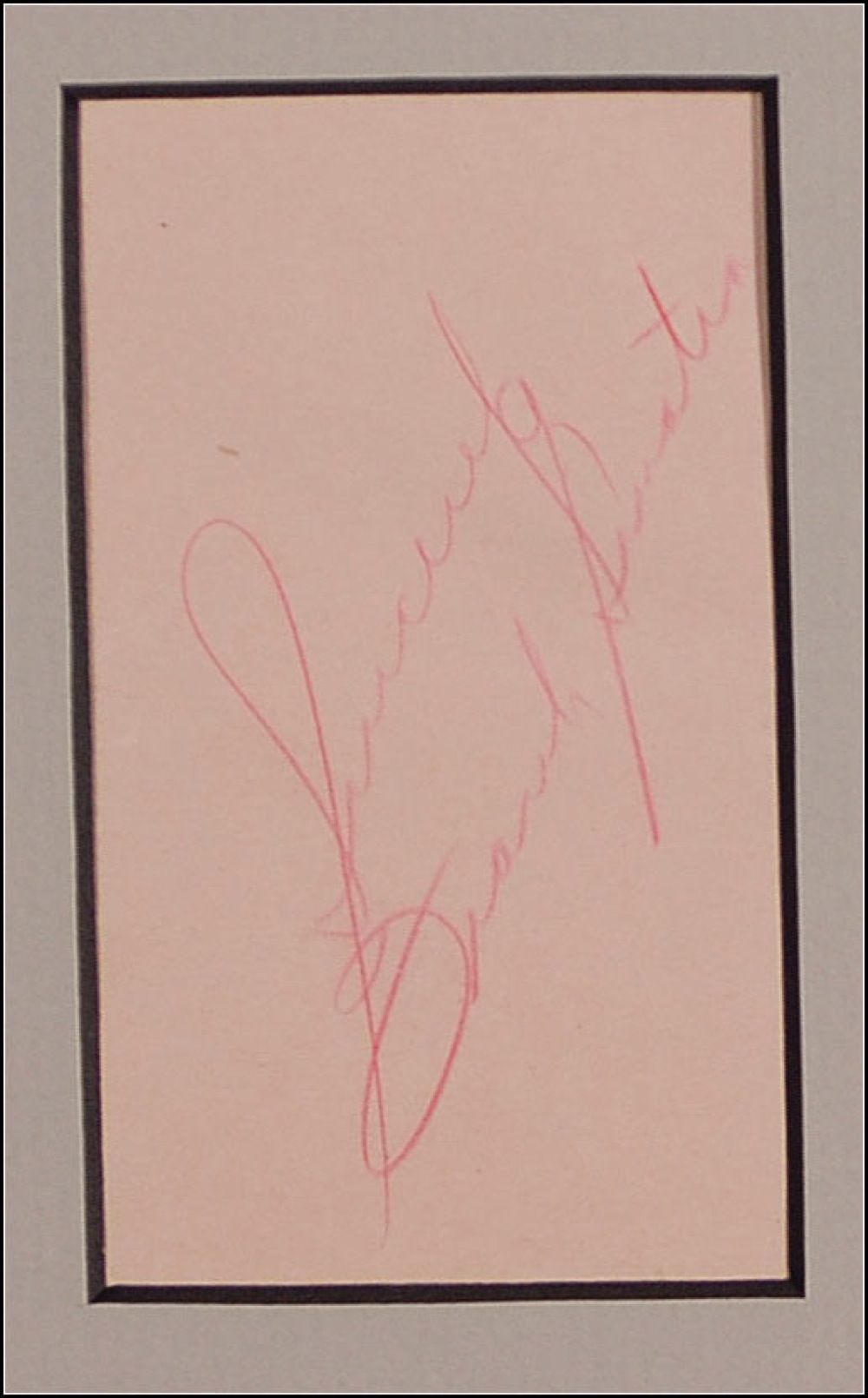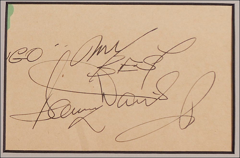 Four vintage items: pink pencil signature, “Sincerely, Frank Sinatra,” on a pink 2 x 3.5 album page; a blue ballpoint signature, “Dean Martin,” on a textured off-white 4 x 3 sheet; a vintage glossy 2.5 x 3 photo of Lawford strolling shirtless down a walk way in Oceans 11, signed in fountain pen; and an ink signature, “My Best, Sammy Davis, Jr.,” on a beige 4.75 x 3 sheet. Matted with the famous shot of the four Rat Pack members playing pool to an overall size of 37 x 28. In fine condition, with a few trivial stray ink marks, a partially matted-out inscription to Davis’s signature and a mild crease, lightly affecting the first name. Oversized. RRAuction COA.